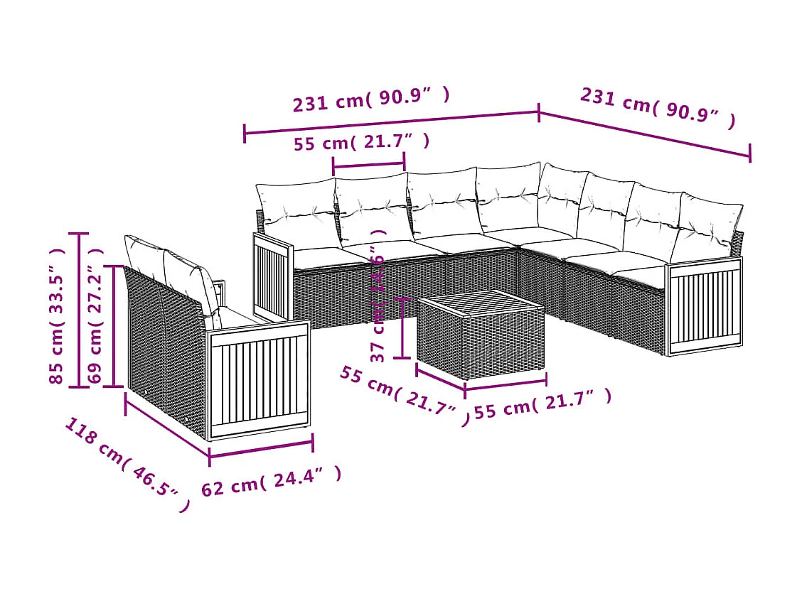 Salon de jardin 10 pcs avec coussins noir résine tressée
