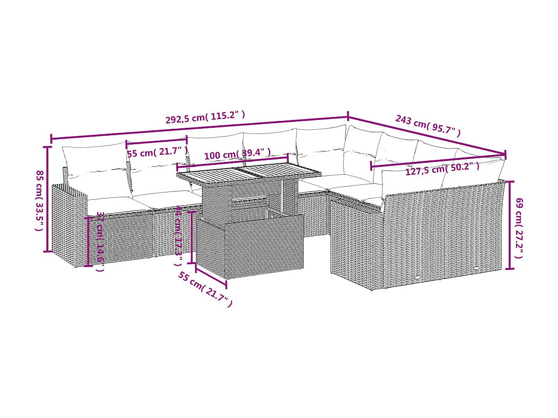 Salon de jardin 10 pcs avec coussins noir résine tressée