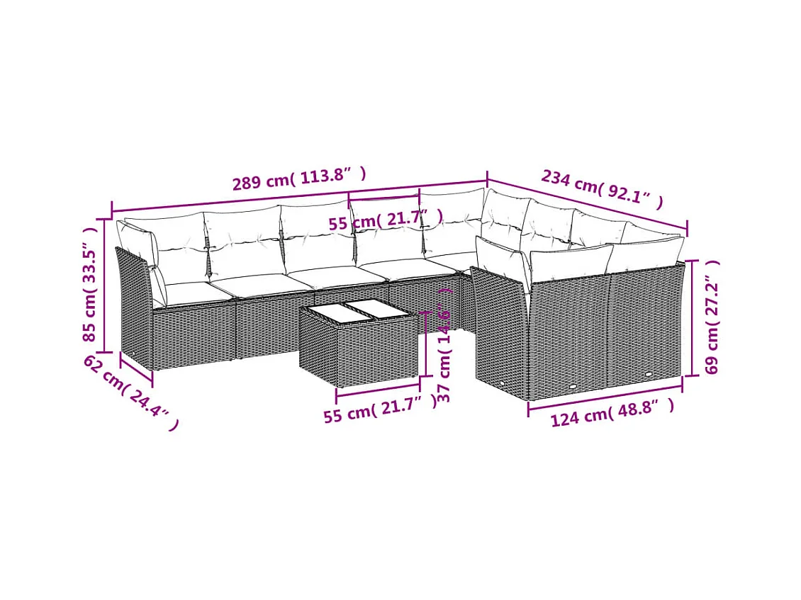 Salon de jardin 10 pièces avec coussins marron résine tressée