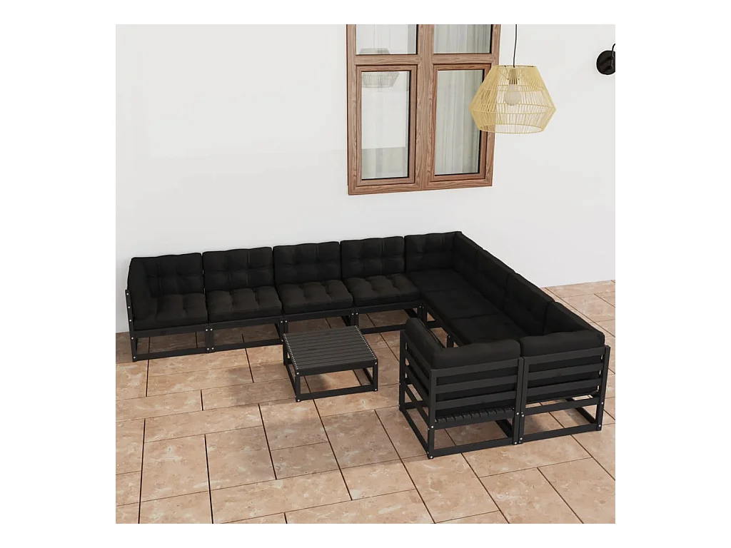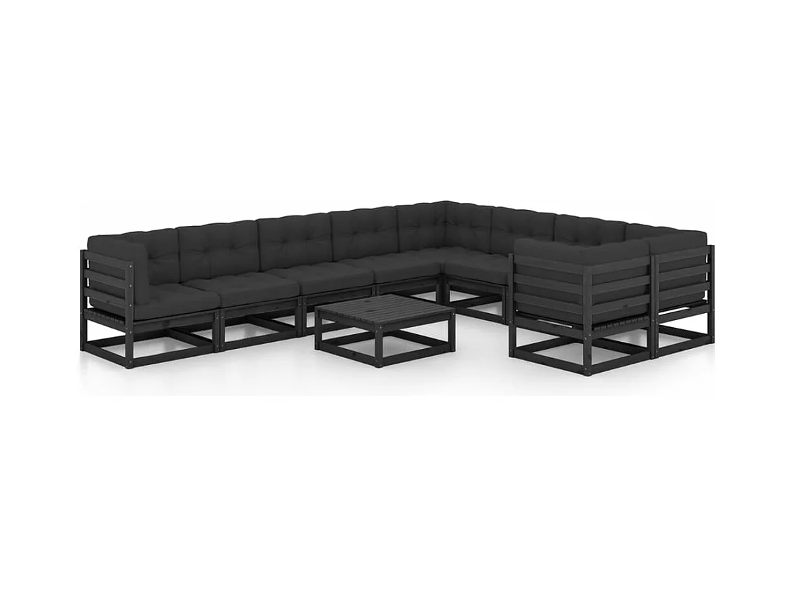 Salon de jardin 10 pièces avec coussins Noir Bois de pin massif