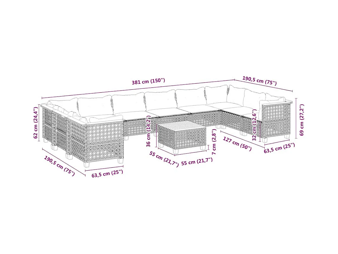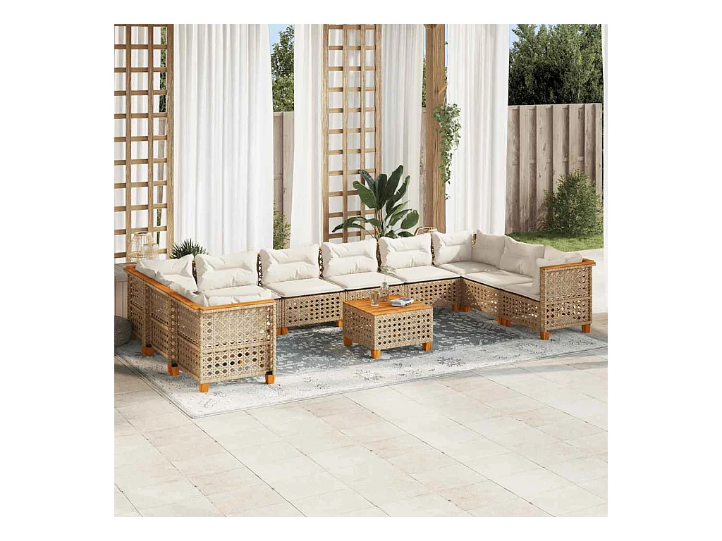 Salon de jardin avec coussins 10 pcs beige résine tressée