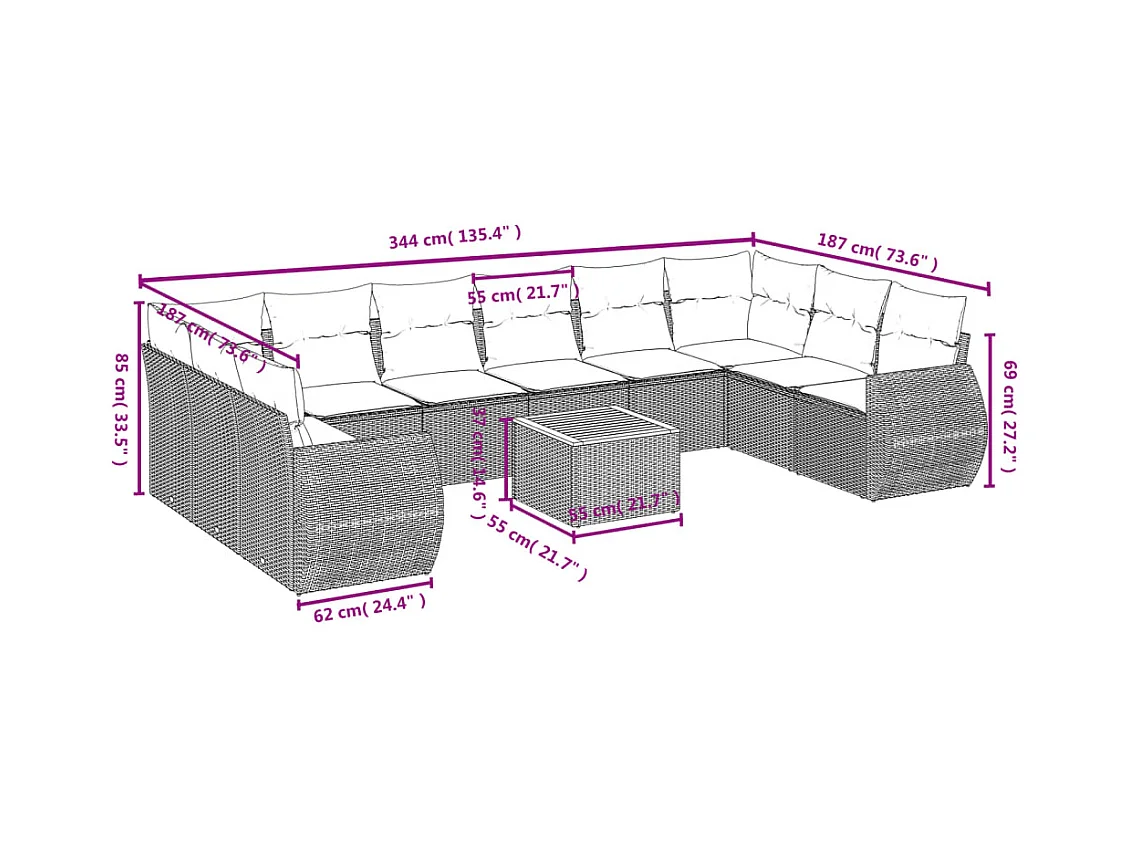 Salon de jardin 11 pcs avec coussins gris résine tressée