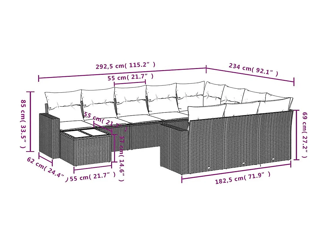 Salon de jardin 11 pcs avec coussins gris résine tressée