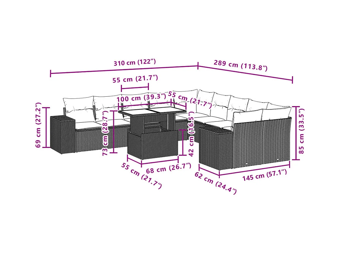 Salon de jardin 10 pcs avec coussins noir résine tressée