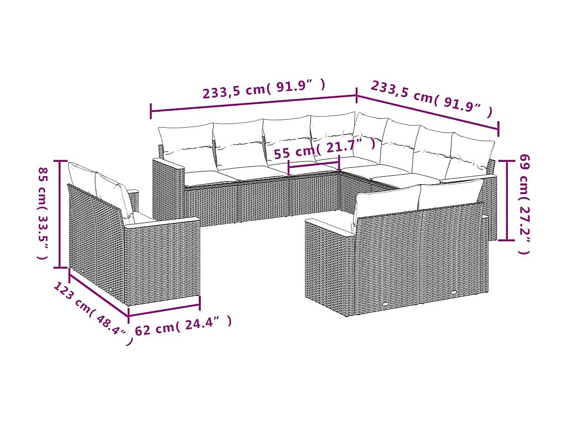 Salon de jardin 11 pcs avec coussins noir résine tressée