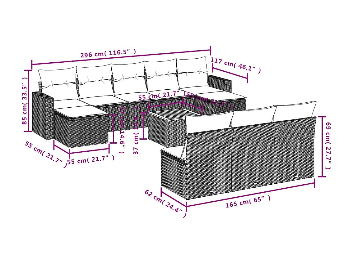 Salon de jardin 10 pcs avec coussins noir résine tressée