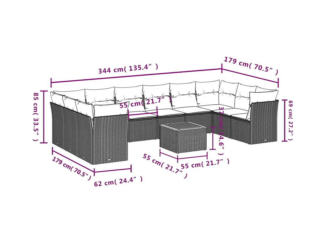 Salon de jardin 11 pièces avec coussins beige résine tressée