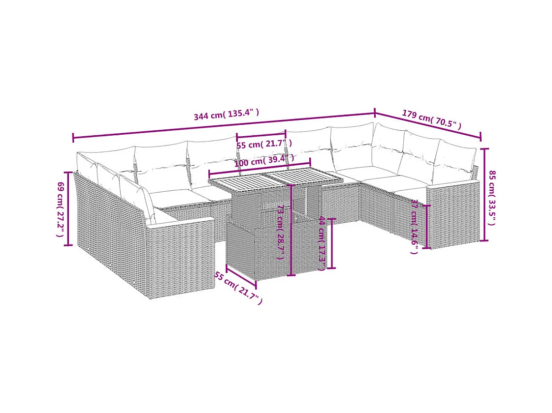Salon de jardin 11 pièces avec coussins beige résine tressée
