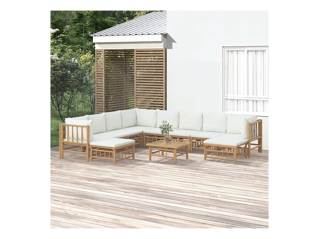 Salon de jardin 11 pièces avec coussins blanc crème bambou