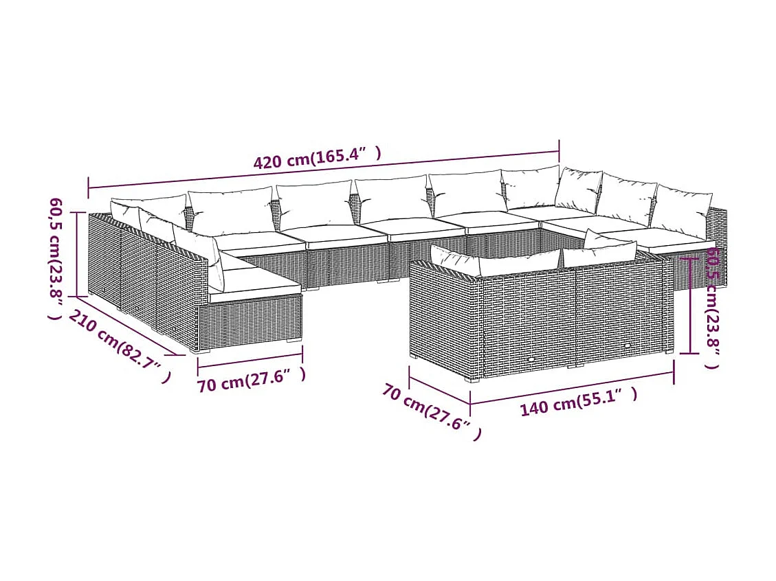 Salon de jardin 12 pcs avec coussins Marron Résine tressée