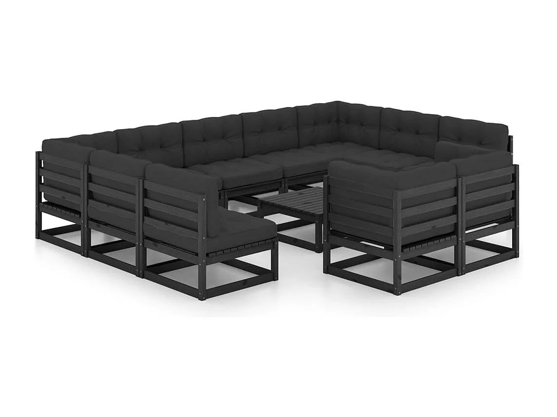 Salon de jardin 12 pcs avec coussins Noir Bois de pin massif