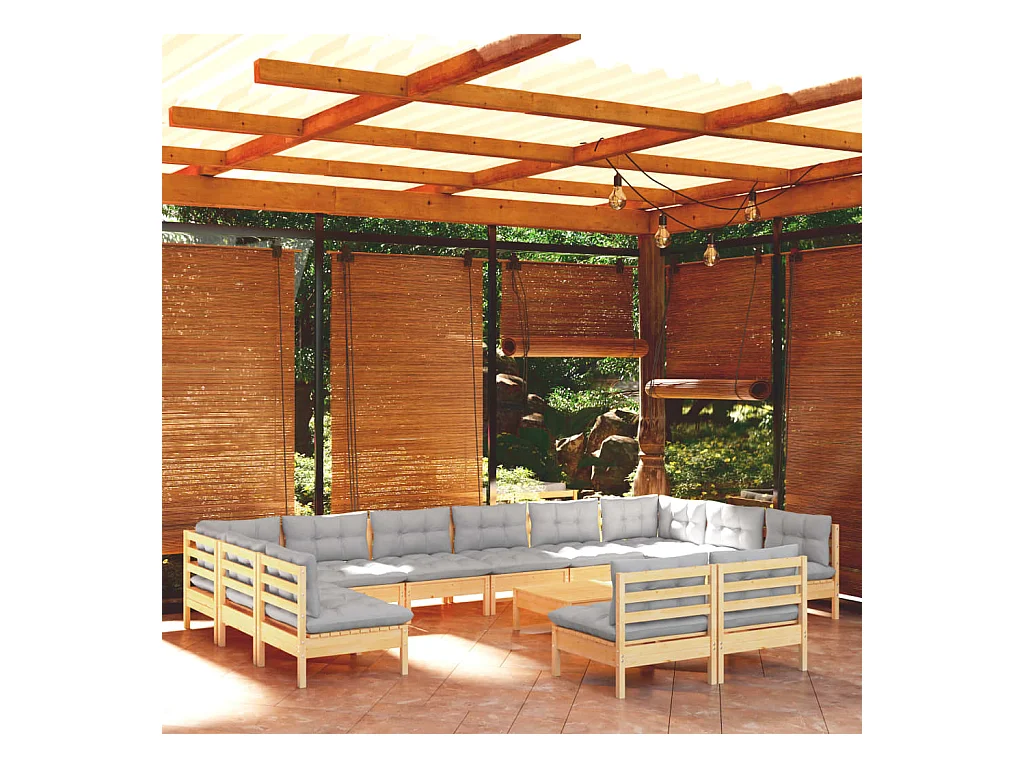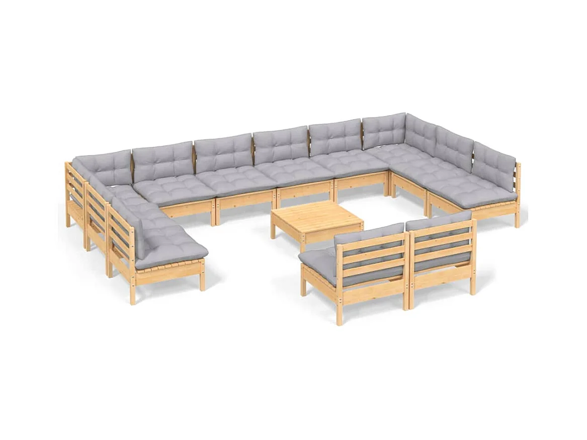 Salon de jardin 13 pcs avec coussins gris Bois de pin solide