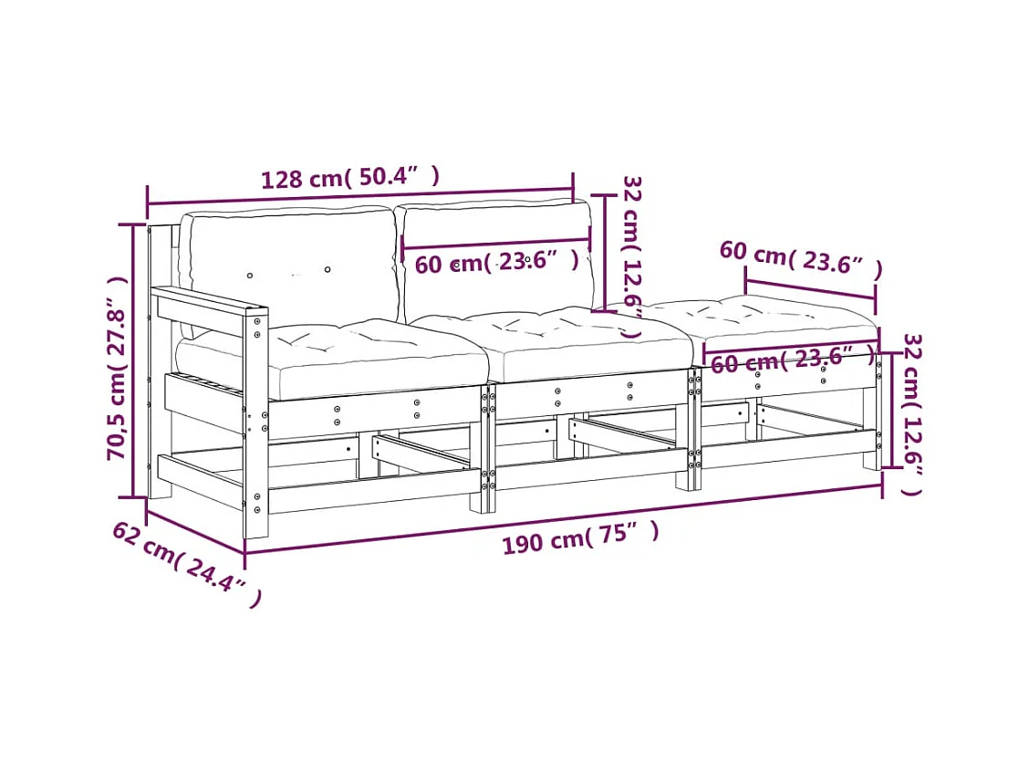 Salon de jardin 3 pcs avec coussins bois massif