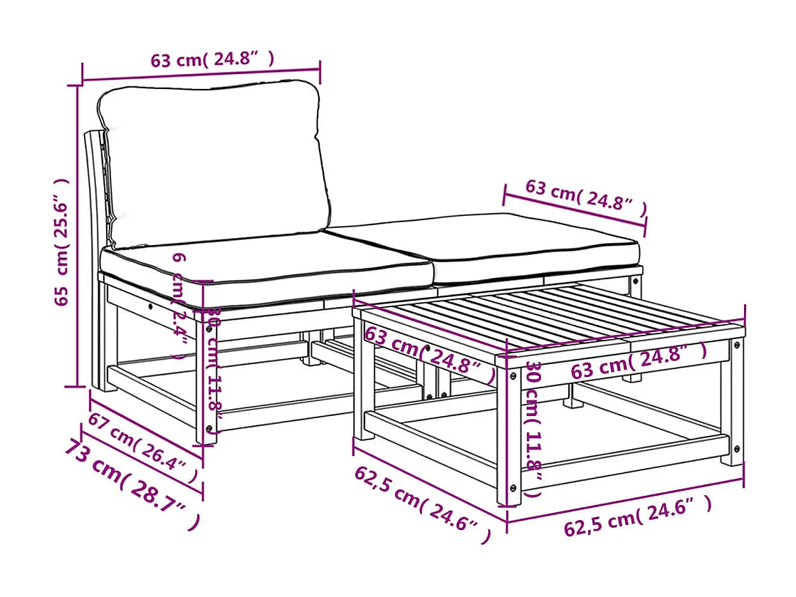 Salon de jardin 3 pcs avec coussins bois massif d'acacia
