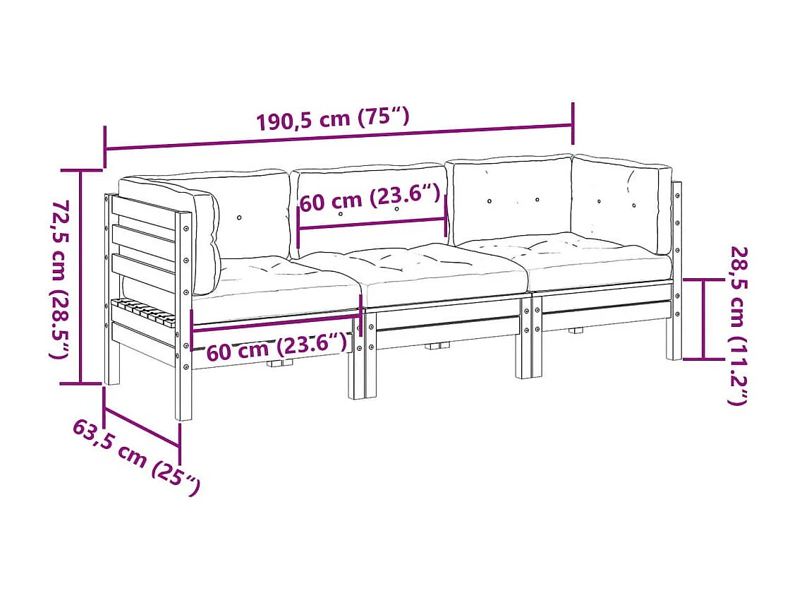Salon de jardin 3 pcs et coussins bois massif sapin de douglas