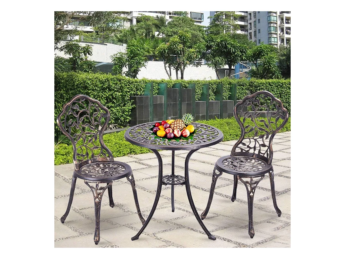 Salon de Jardin 3Pcs en Fonte Aluminium, Ensemble 2 Chaises et 1 Table Ronde Style Rétro avec Motif Feuille pour Balcon, Terasse, Jardin (Brun)
