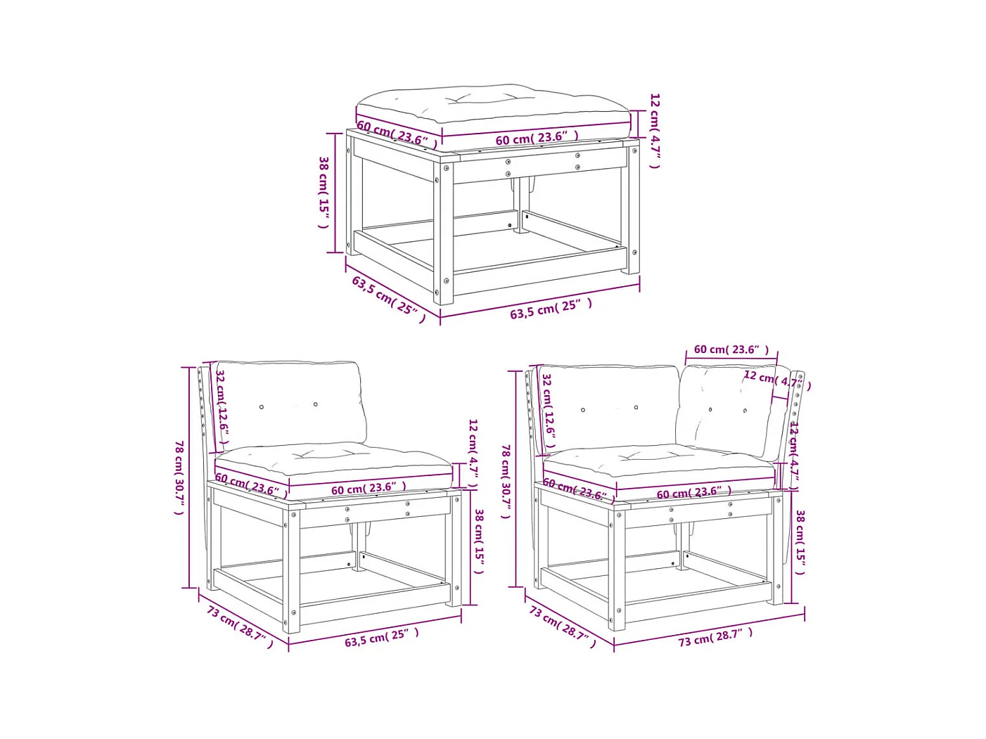 Salon de jardin 3 pcs avec coussins bois de pin massif