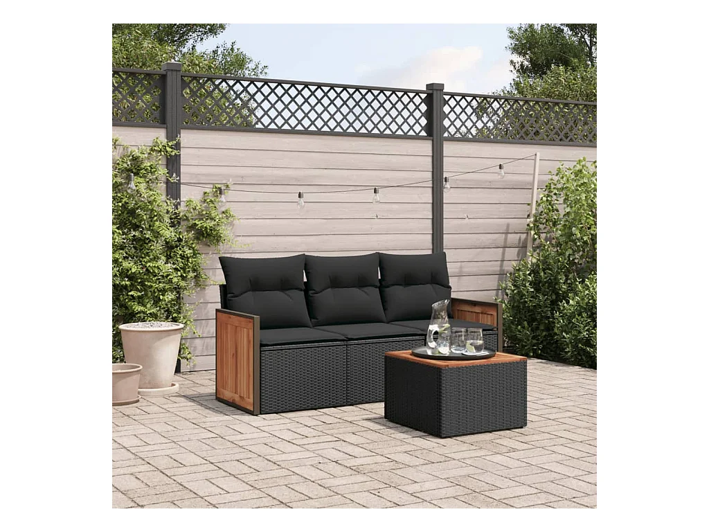 Salon de jardin 4 pcs avec coussins noir résine tressée FR82442
