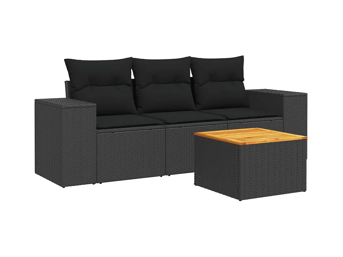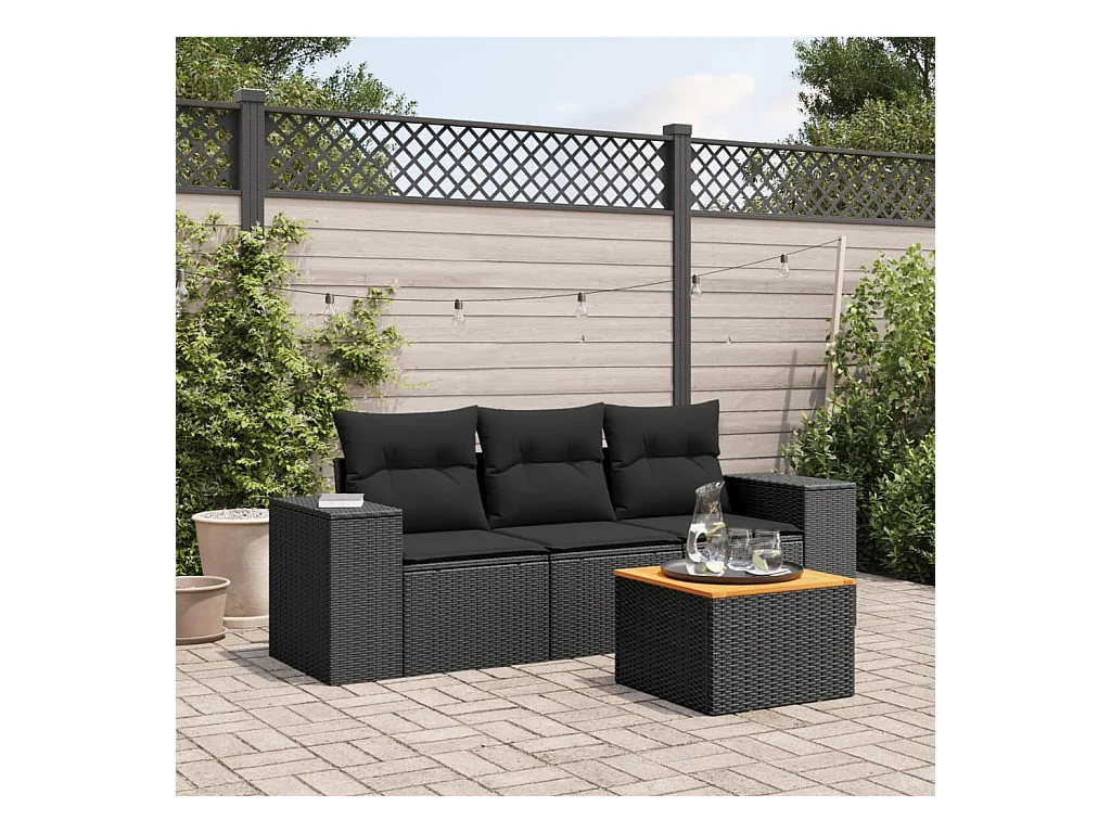 Salon de jardin 4 pcs avec coussins noir résine tressée BE77376