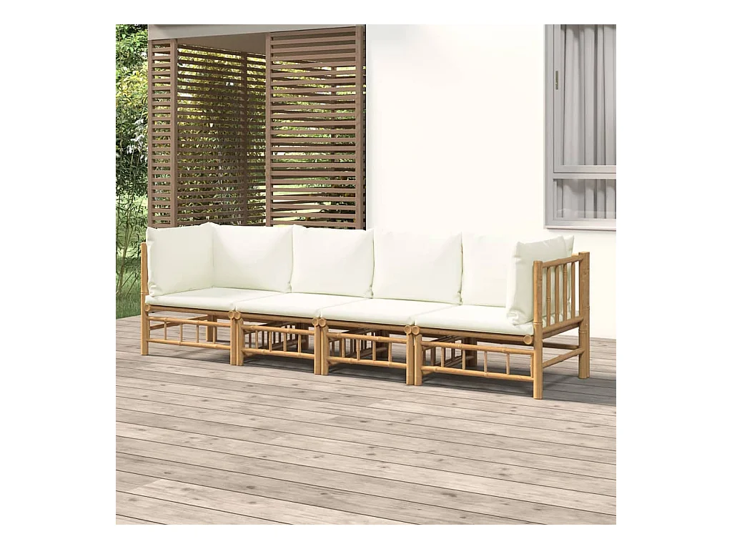 Salon de jardin 4 pièces avec coussins blanc crème bambou