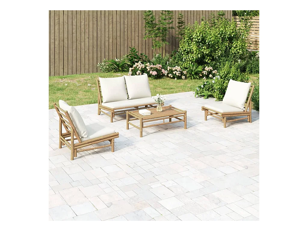 Salon de jardin 4 pièces avec coussins blanc crème bambou
