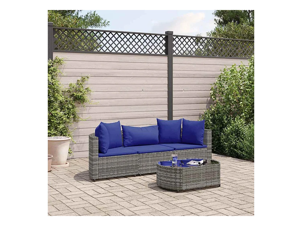 Salon de jardin 4 pièces avec coussins gris résine tressée
