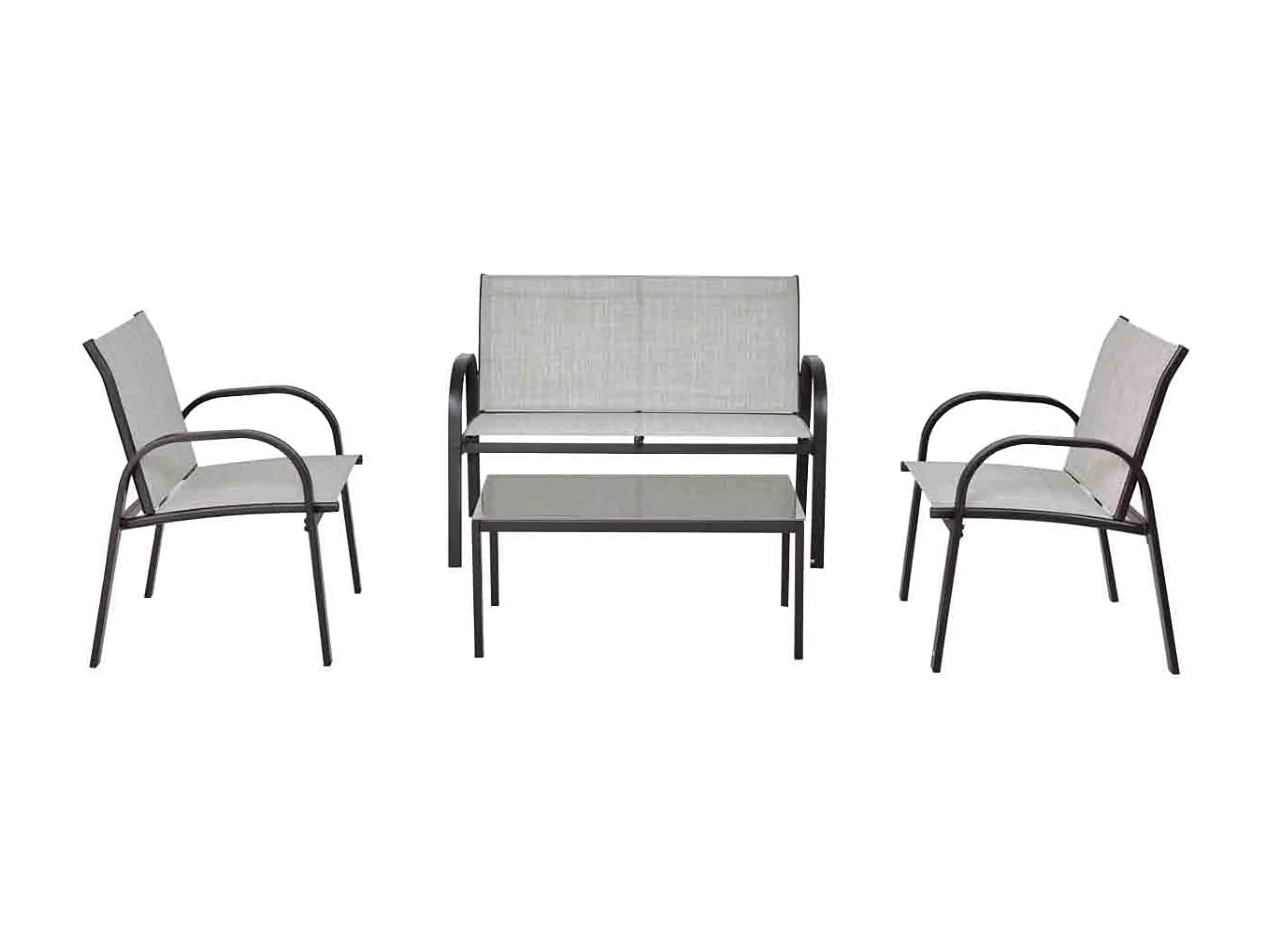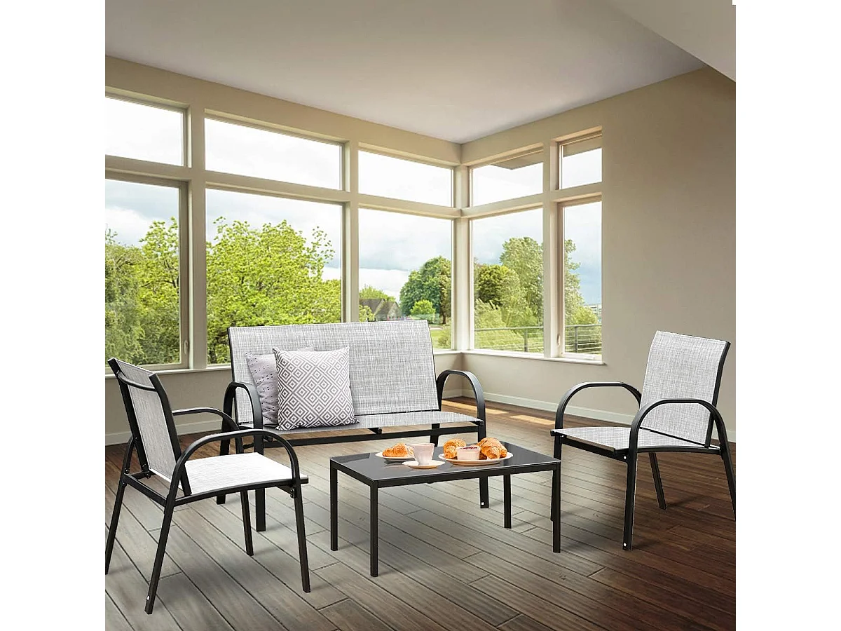 Salon de Jardin 4 Places 4 Pièces en Textilène avec 2 Chaises 1 Banc et 1 Table Basse Vitrée Cadre en Métal pour Baclon/Terrasse/Patio,Gris