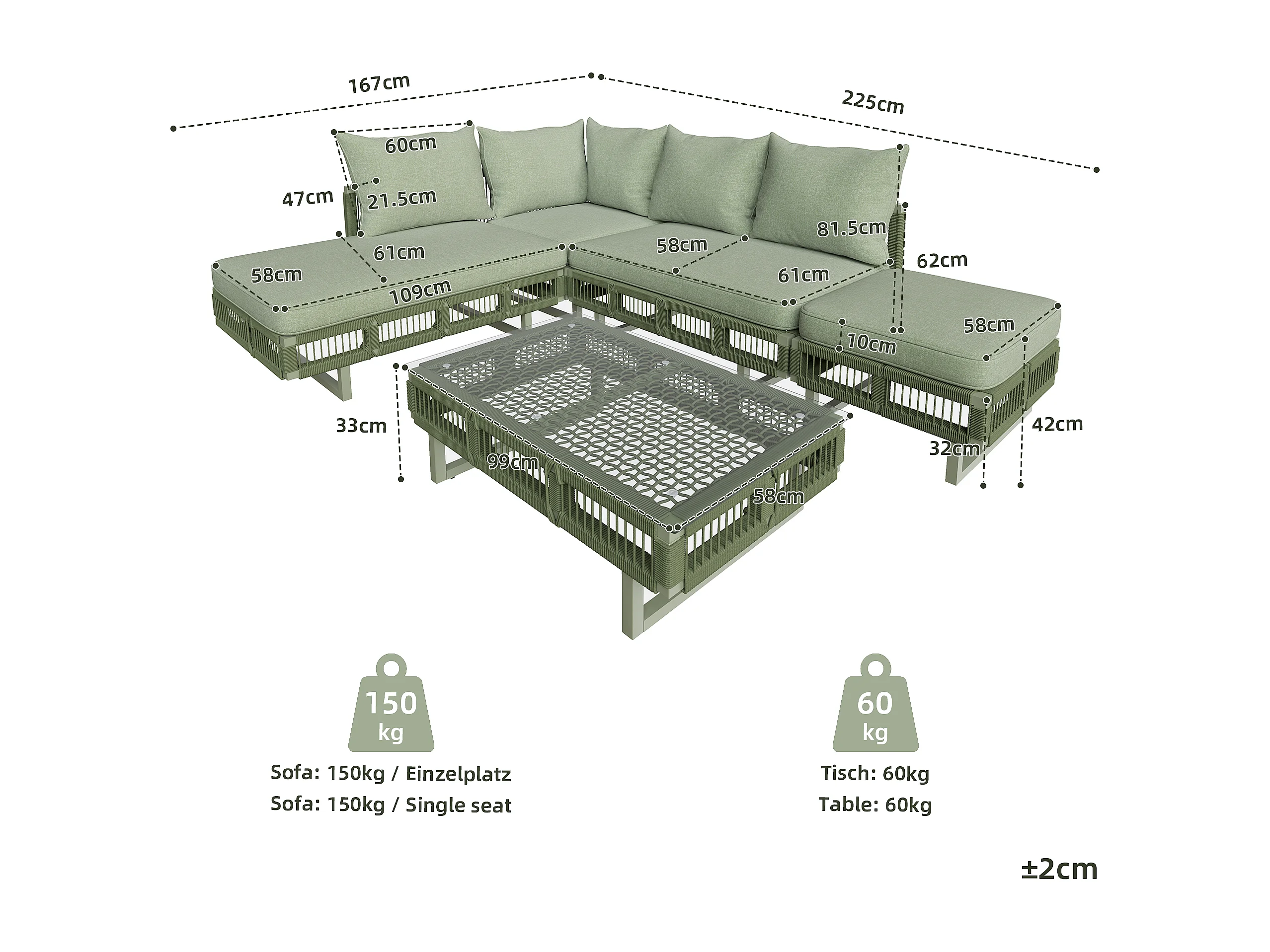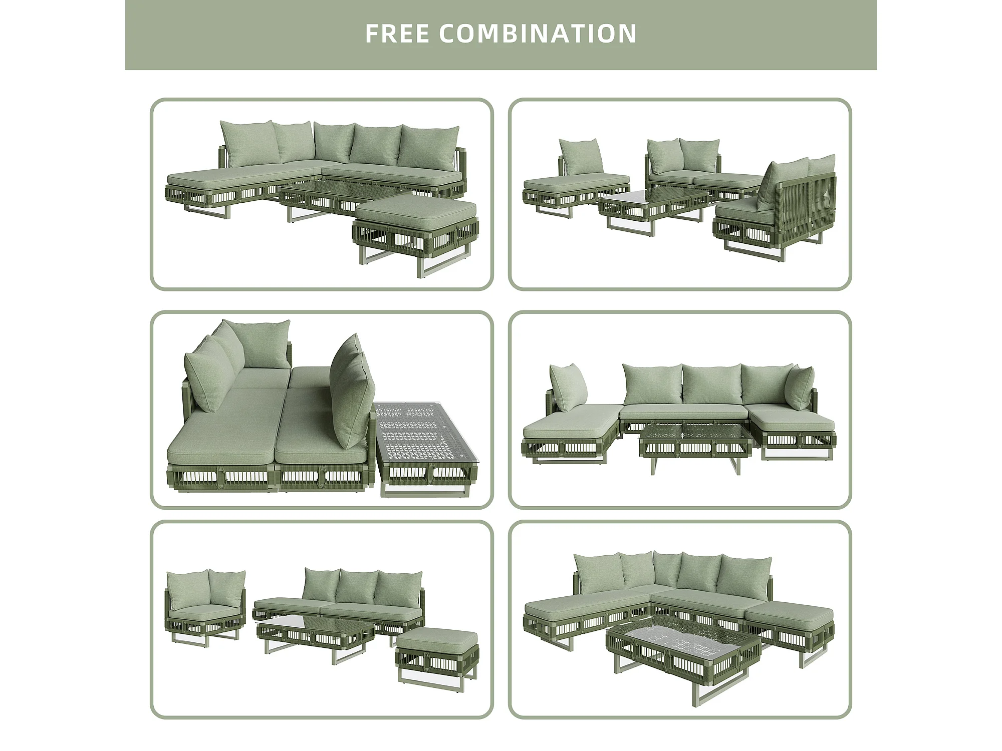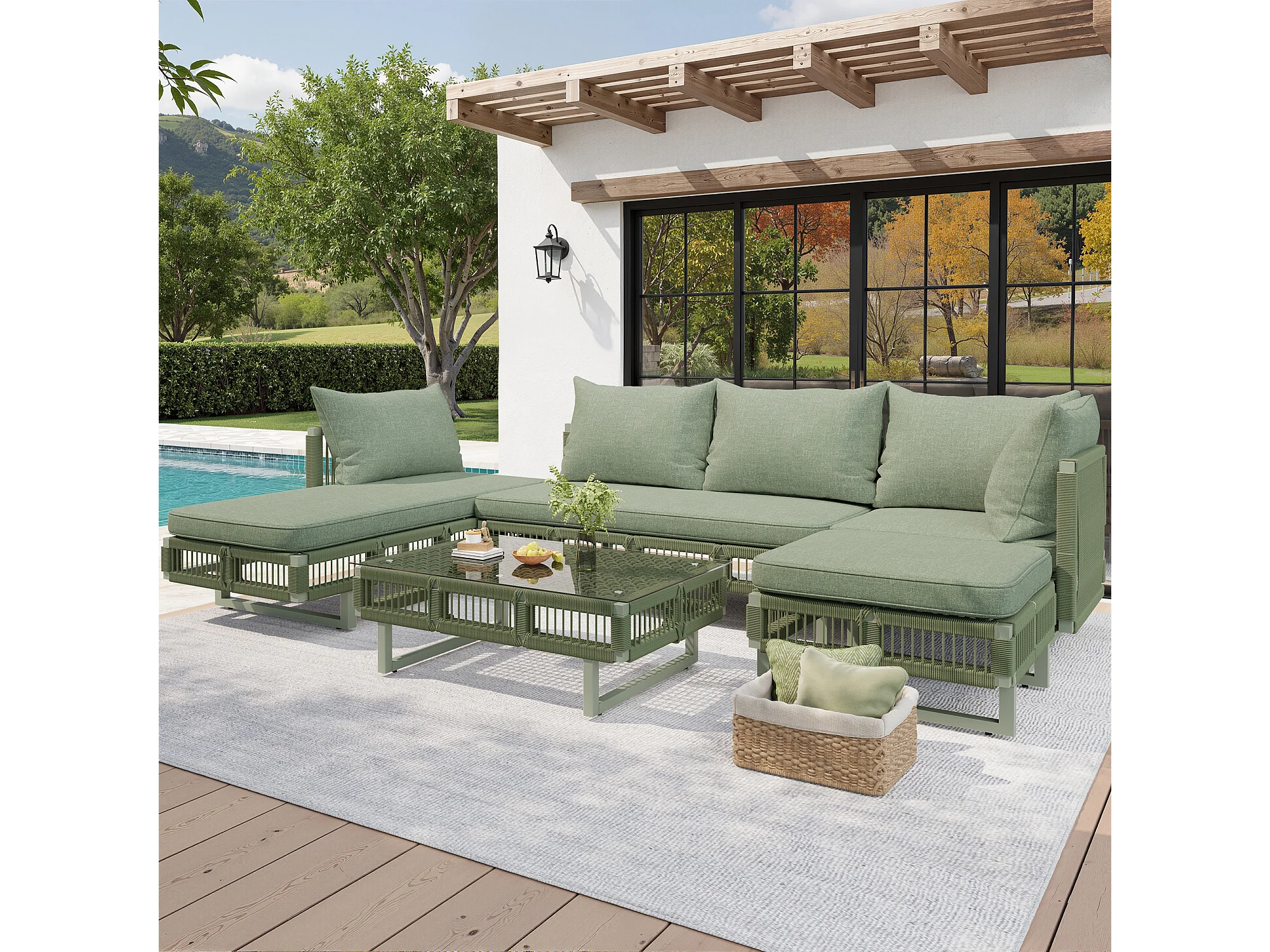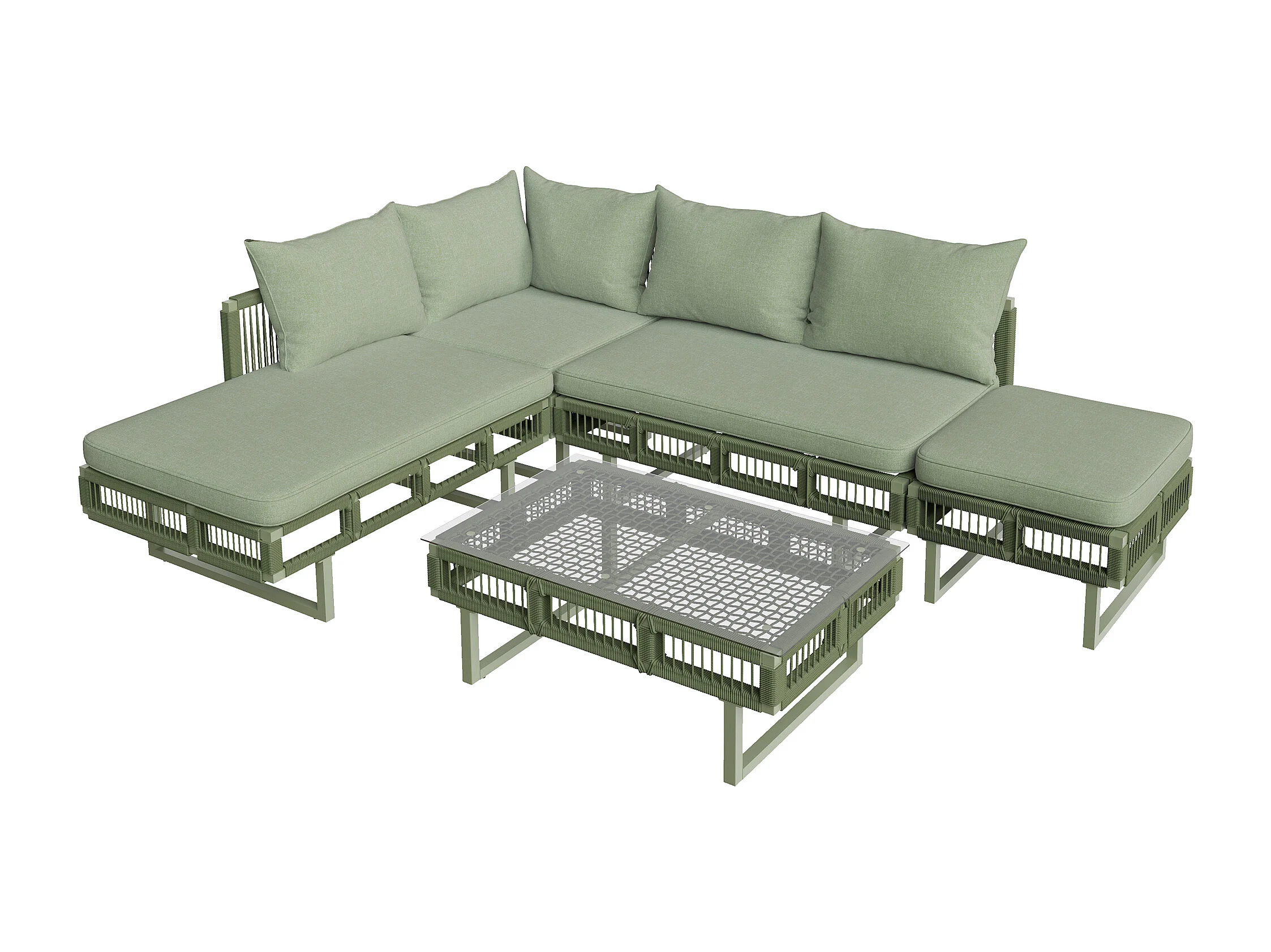 Salon de jardin - 4 places - canapé d'angle - en fer galvanisé - 1 table basse en verre trempé - repose-pieds - décoré tressé - Vert