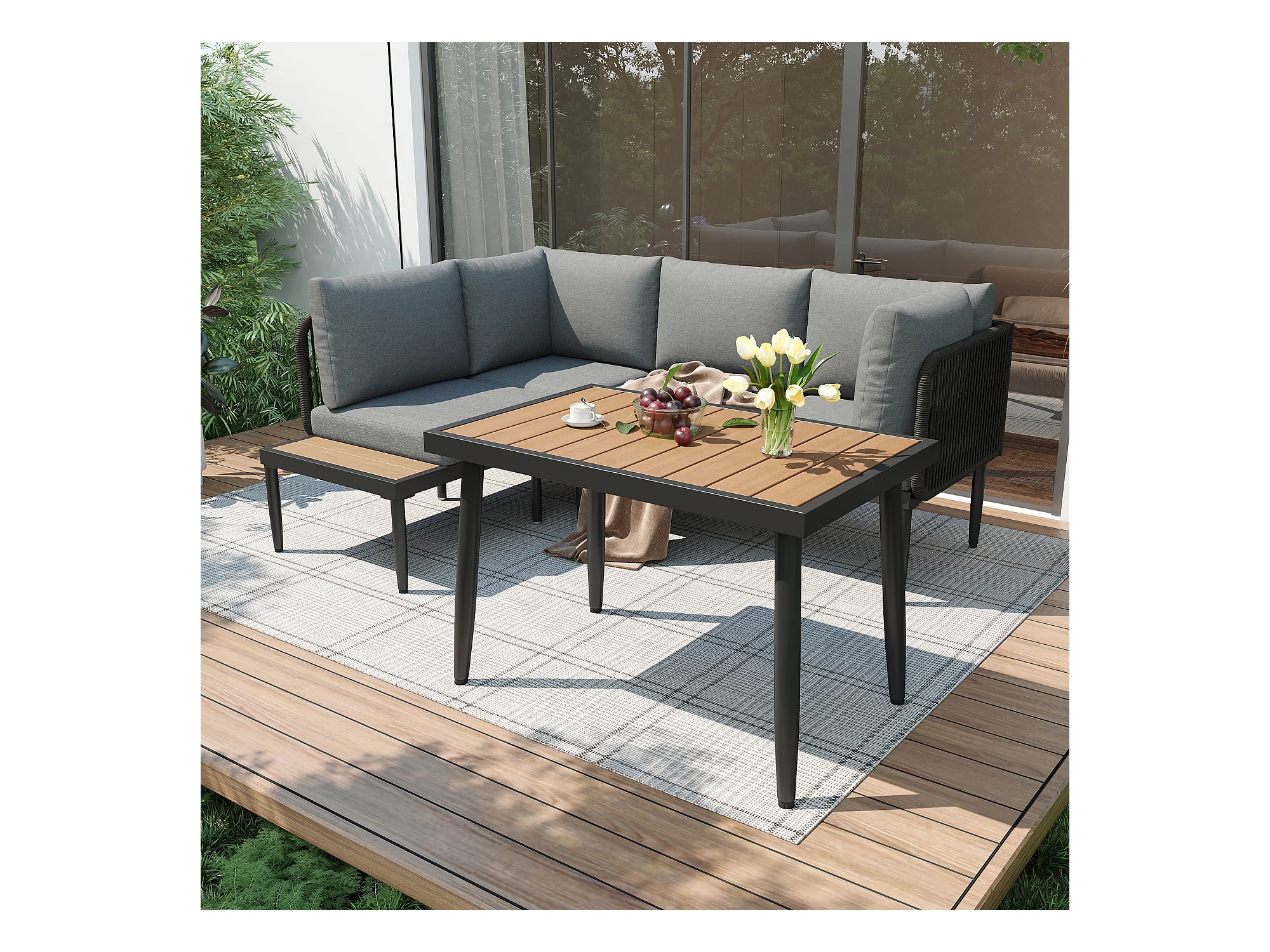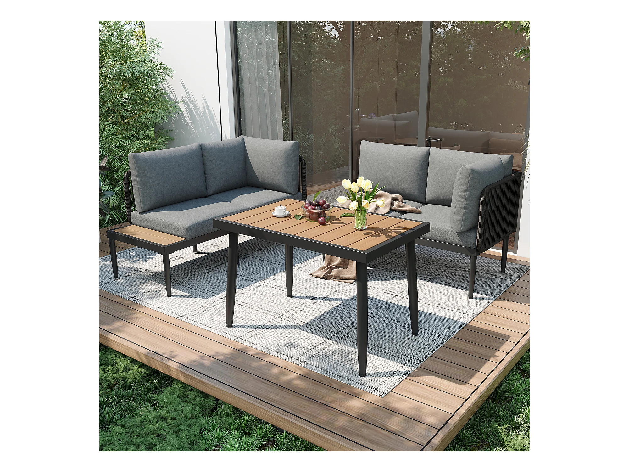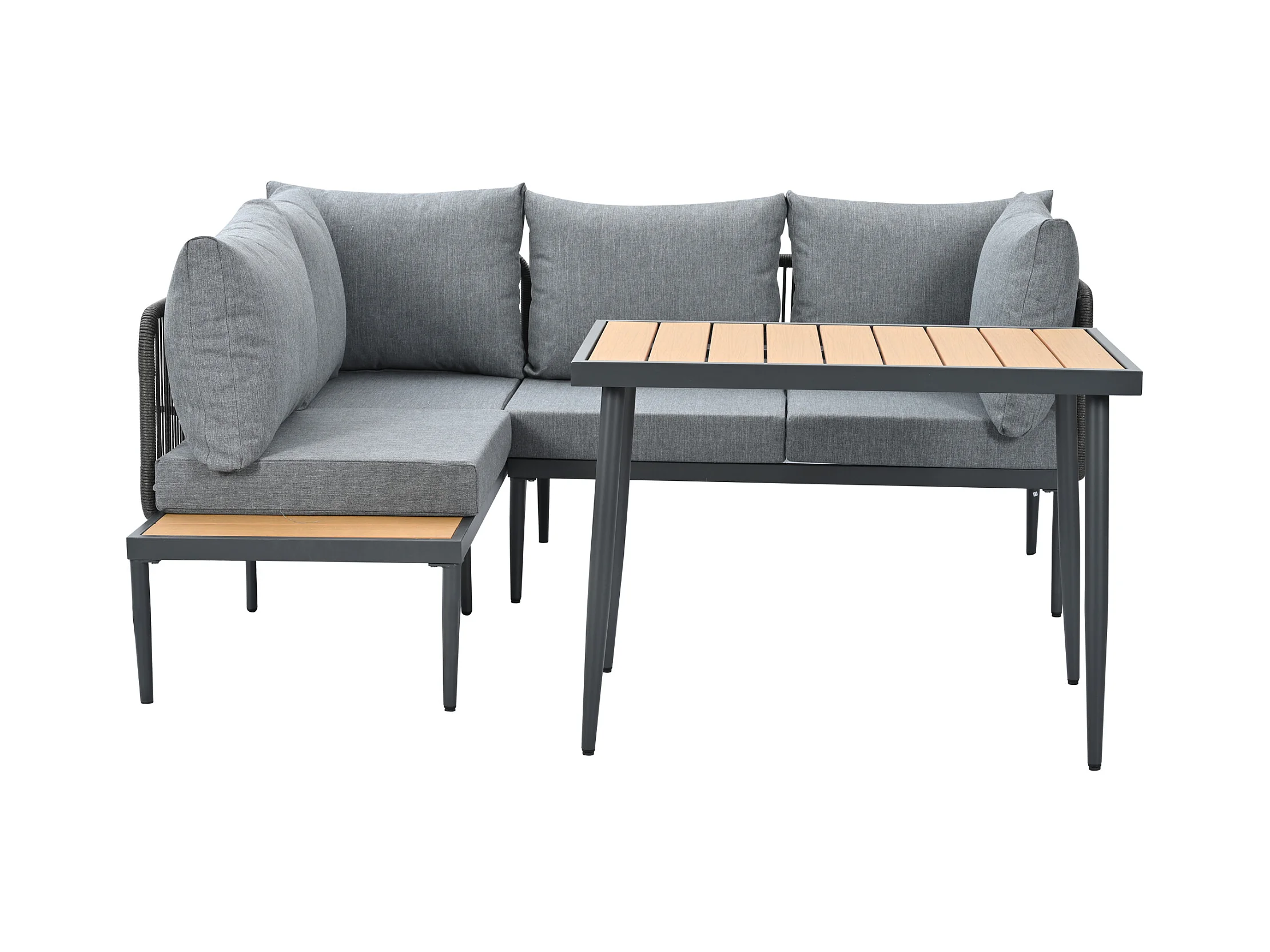 Salon de jardin 4 places - en fer galvanisé léger - plateau en plastique-bois - anapé d'angle + table à manger - gris