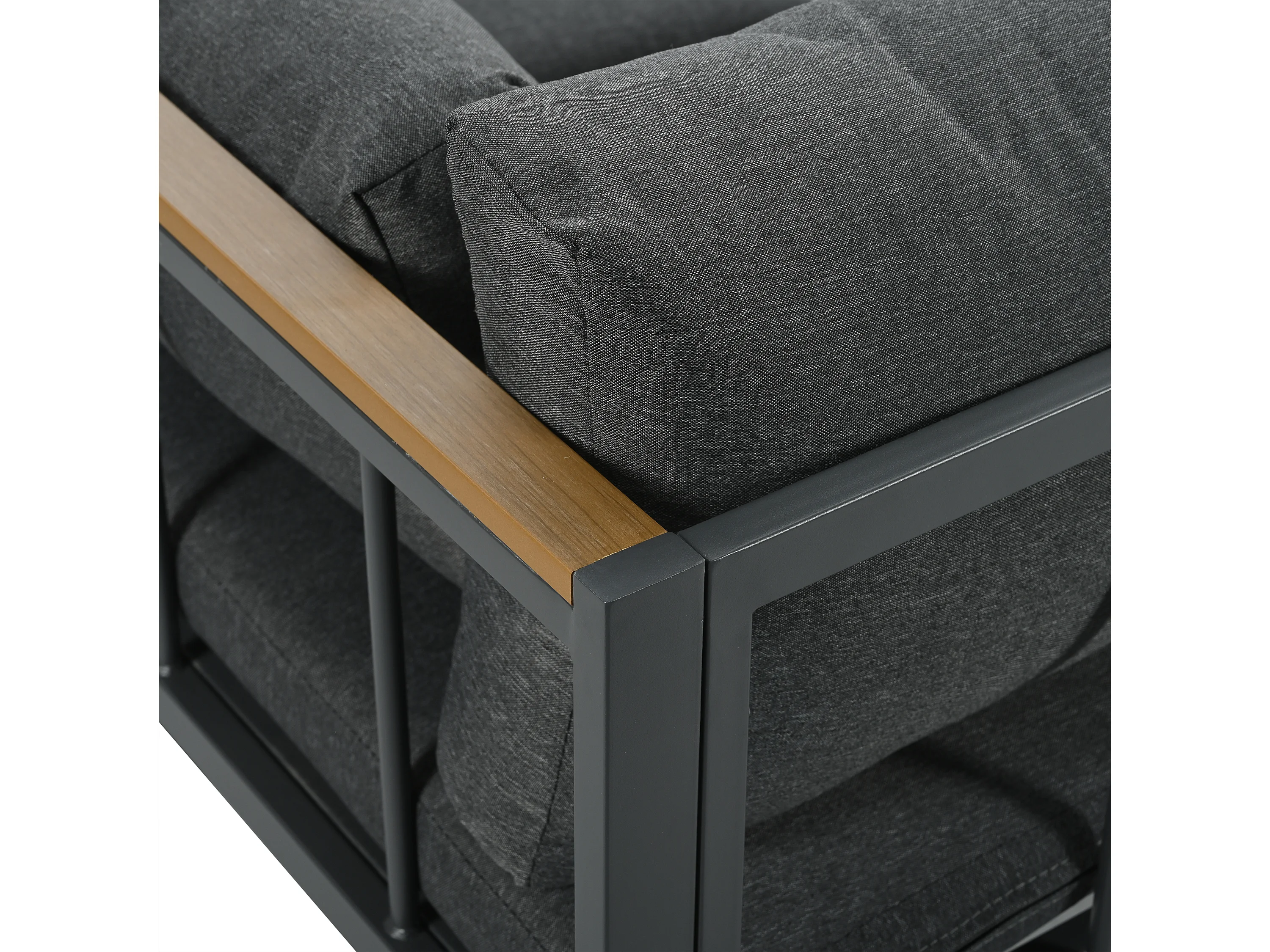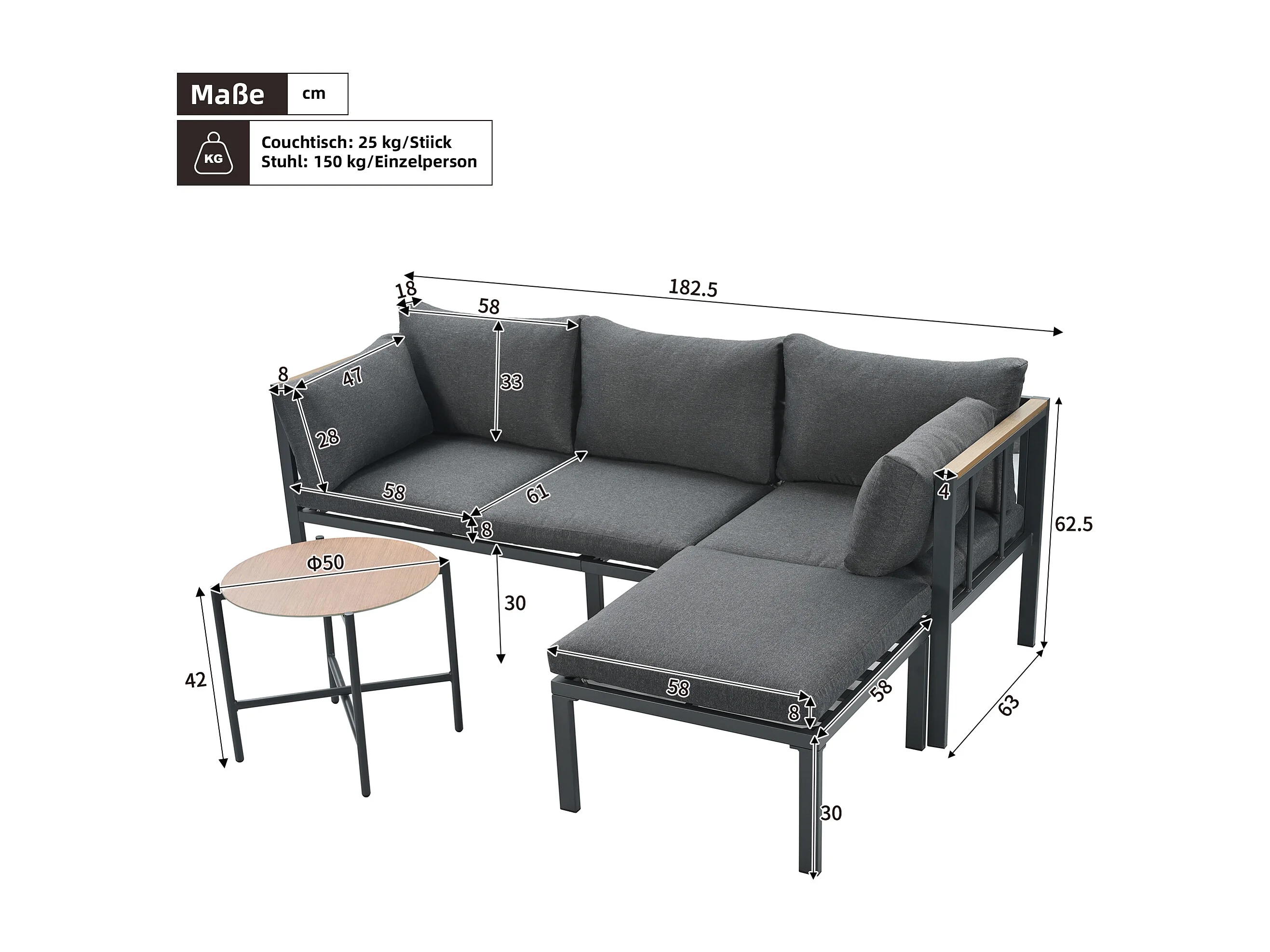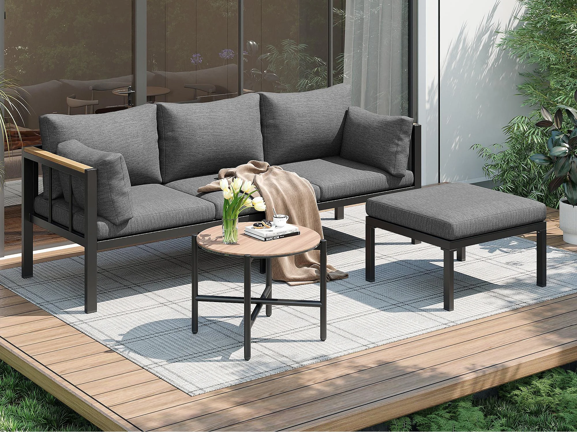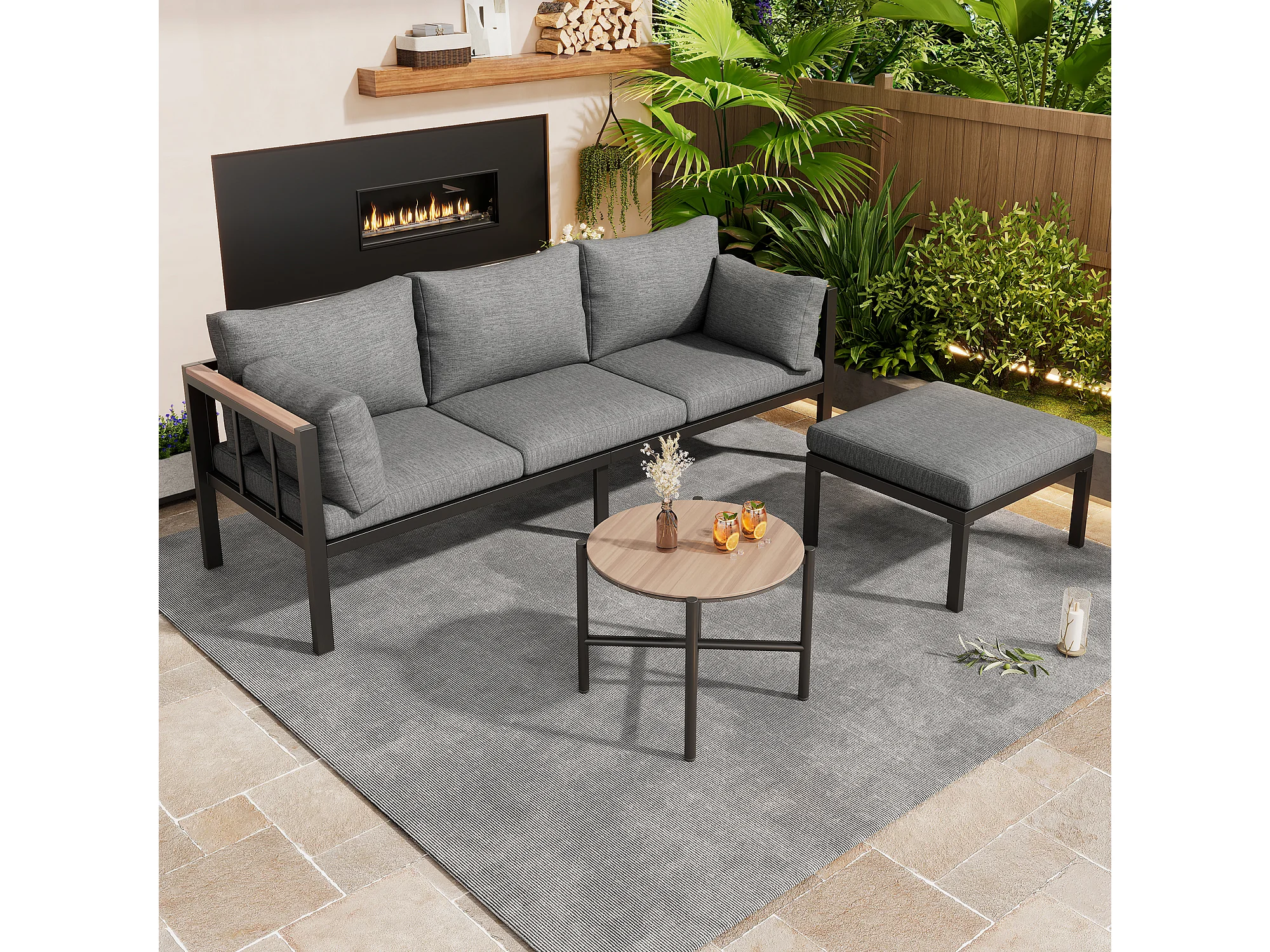 Salon de jardin - 4 places - ensemble d'angle, canapé + table basse + repose-pieds, tube en acier galvanisé, plateau en verre - Gris