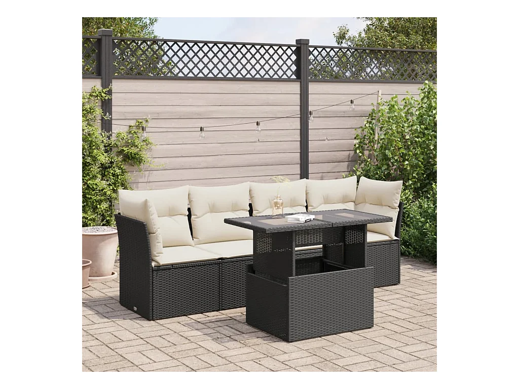 Salon de jardin 6 pcs avec coussins noir résine tressée