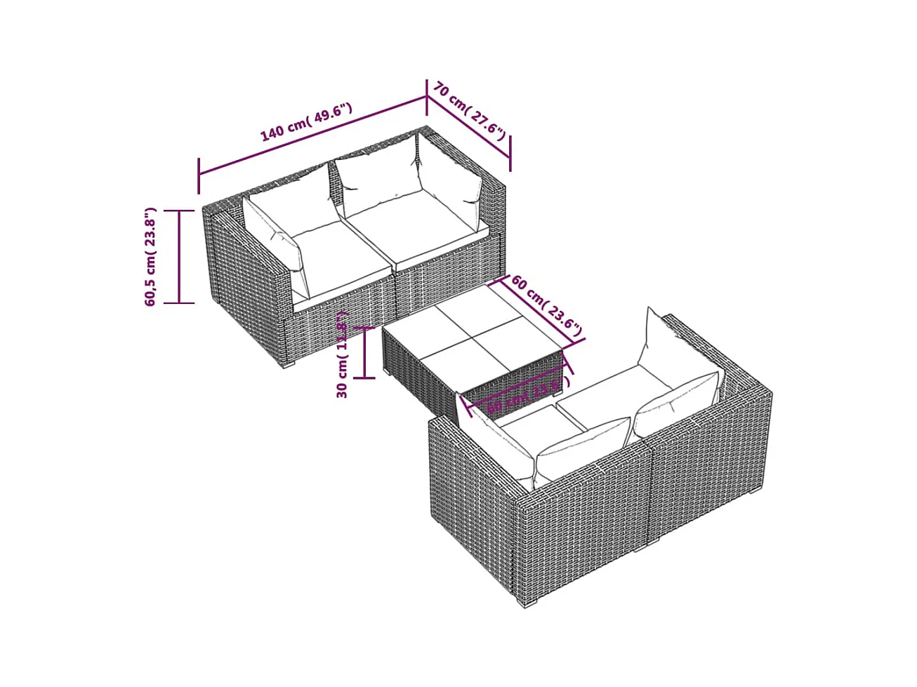 Salon de jardin 5 pcs avec coussins Résine tressée Marron