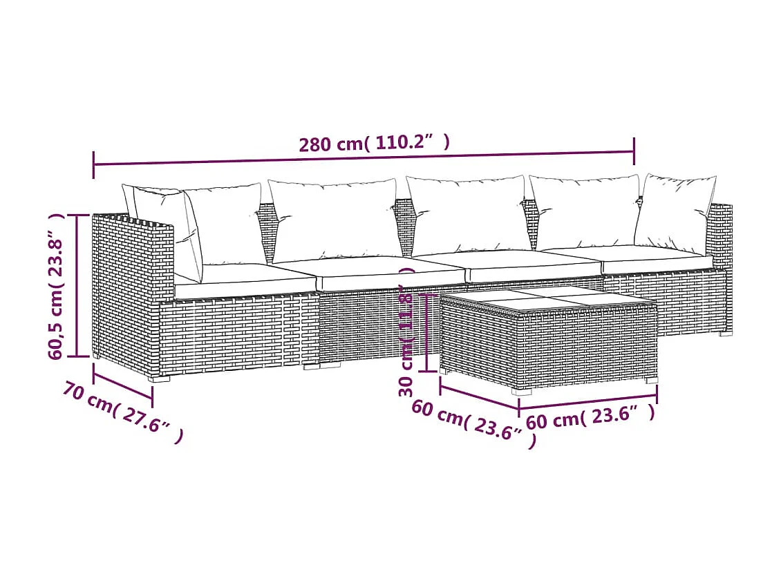 Salon de jardin 5 pcs avec coussins résine tressée noir