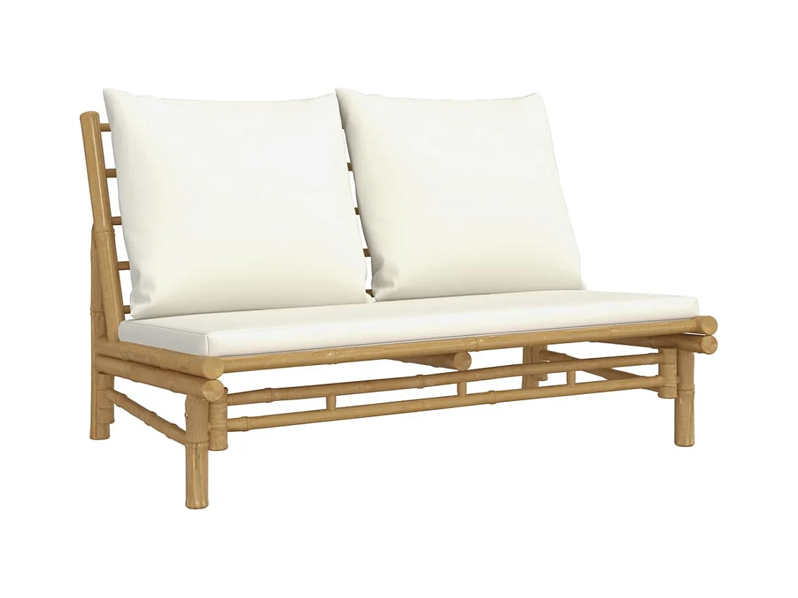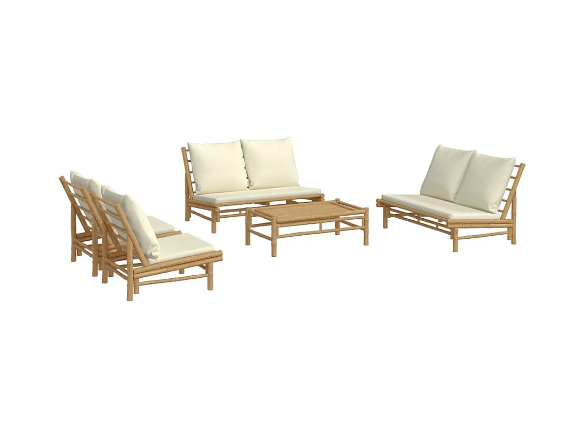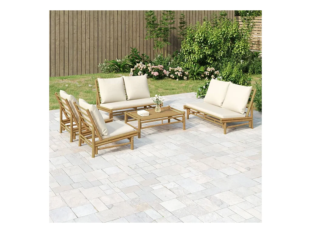 Salon de jardin 5 pièces avec coussins blanc crème bambou