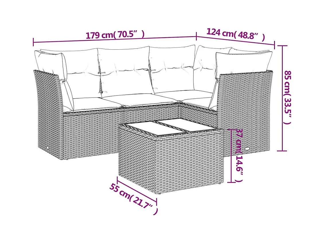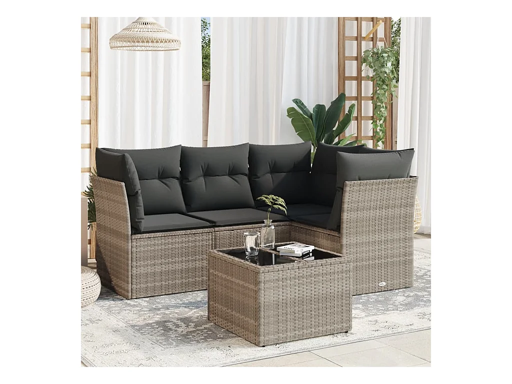 Salon de jardin 5 pièces avec coussins gris résine tressée