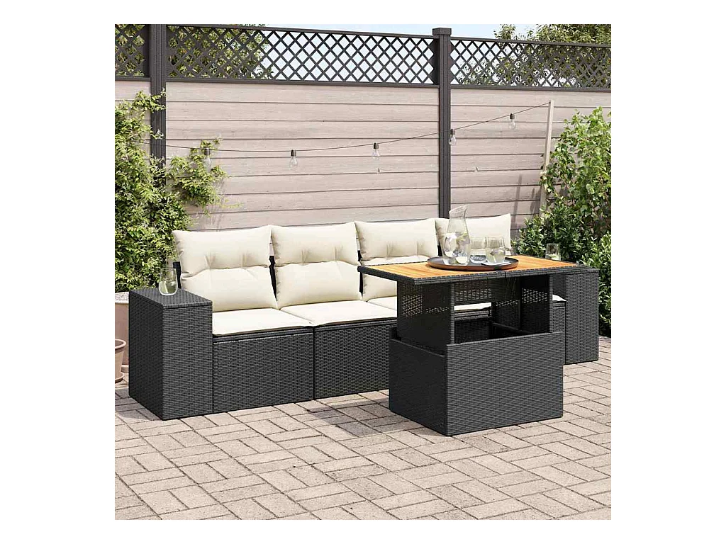 Salon de jardin 5 pièces avec coussins noir résine tressée acacia