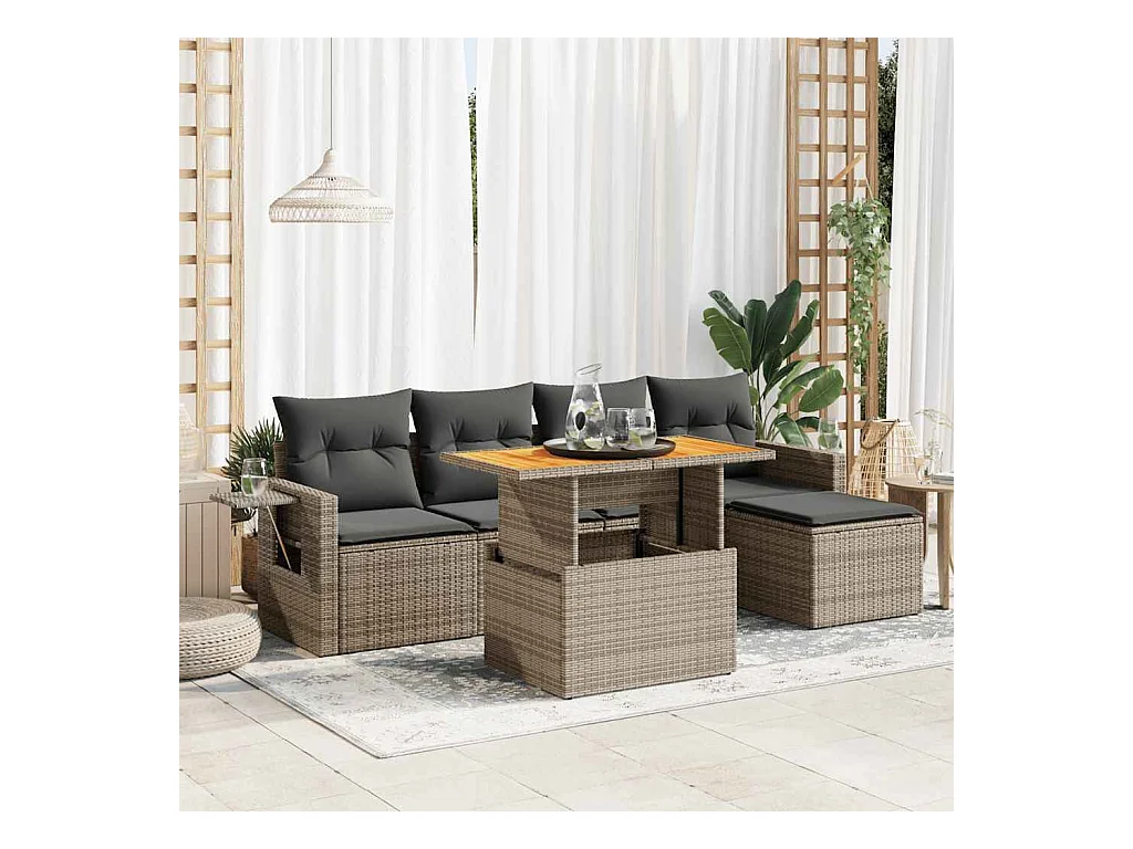 Salon de jardin 6 pcs avec coussins gris résine tressée