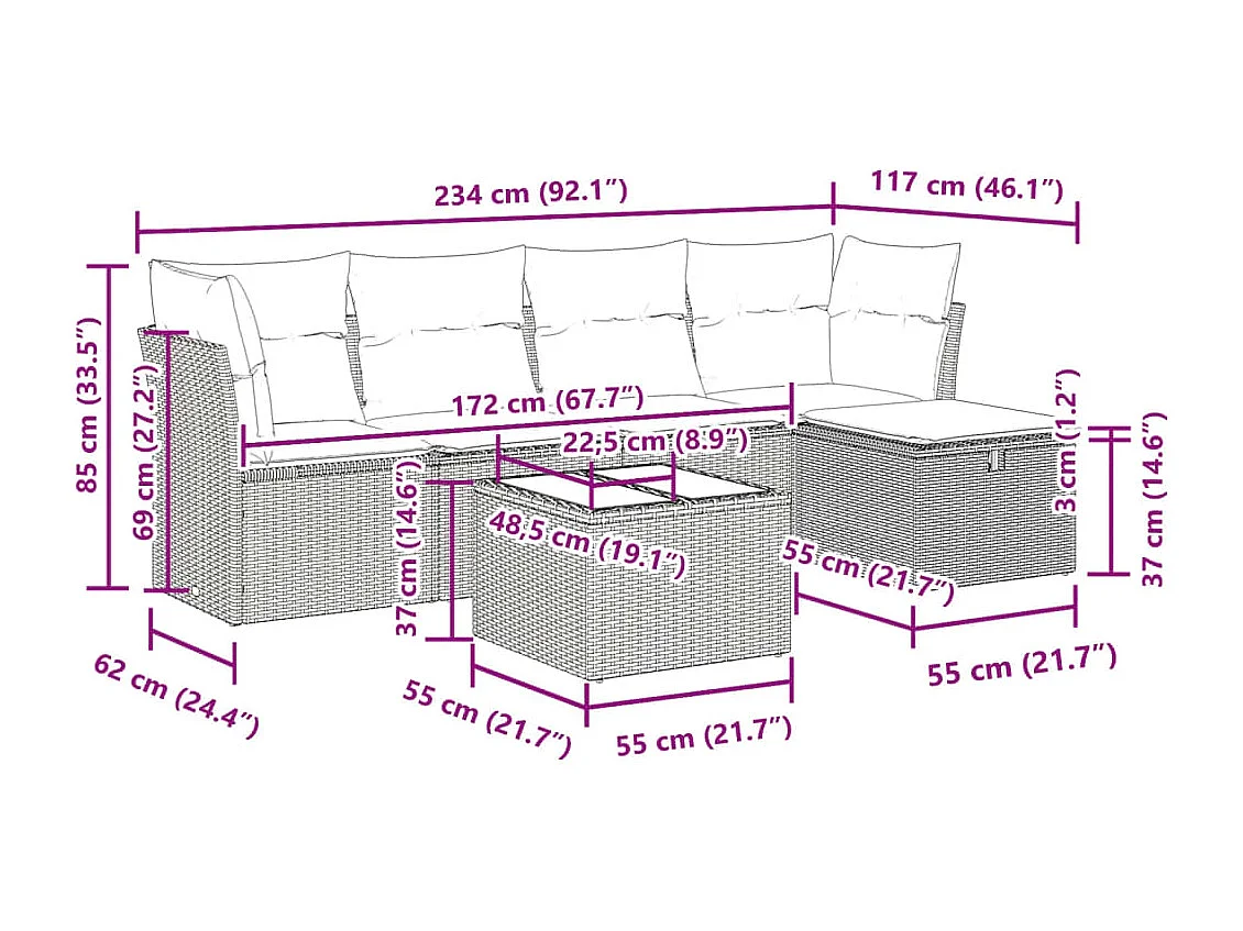 Salon de jardin 6 pcs avec coussins noir résine tressée