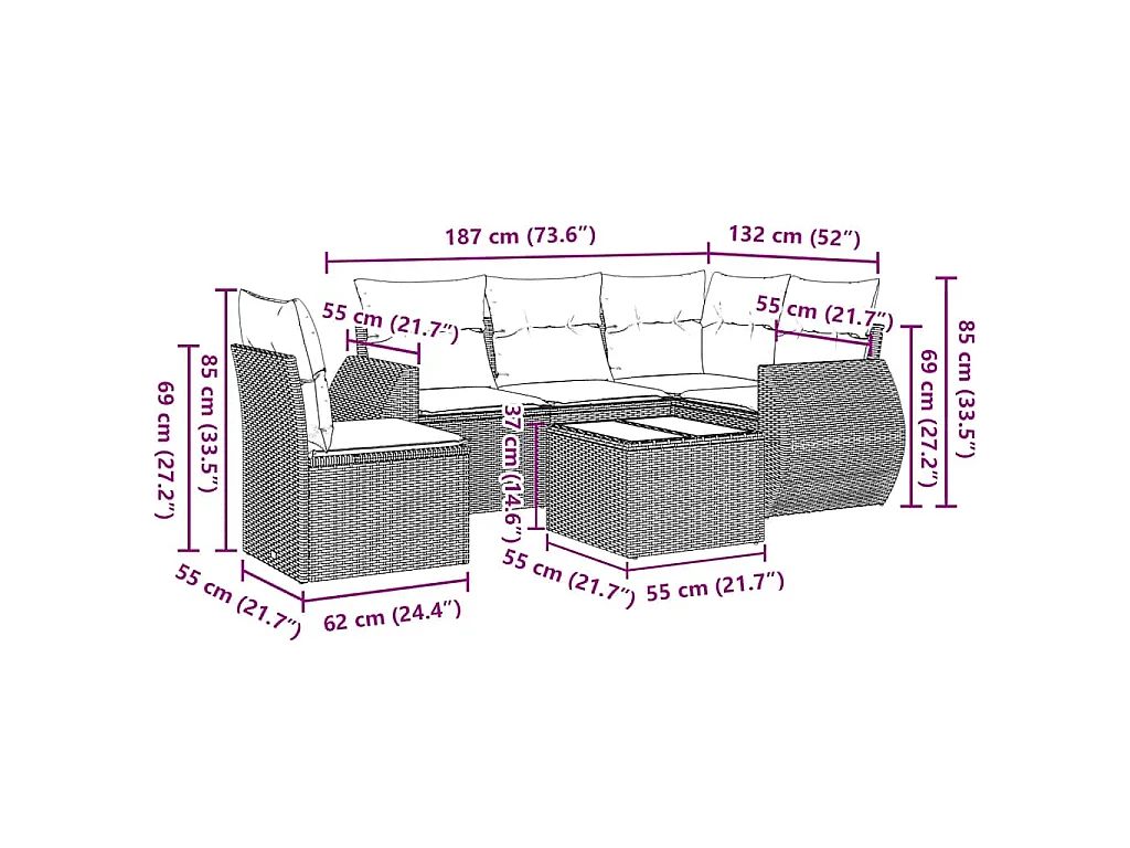 Salon de jardin 6 pcs avec coussins noir résine tressée