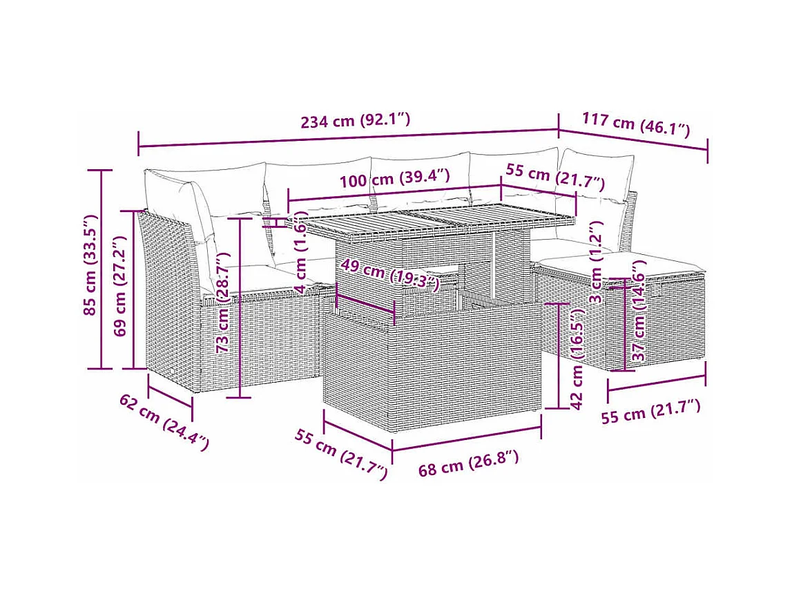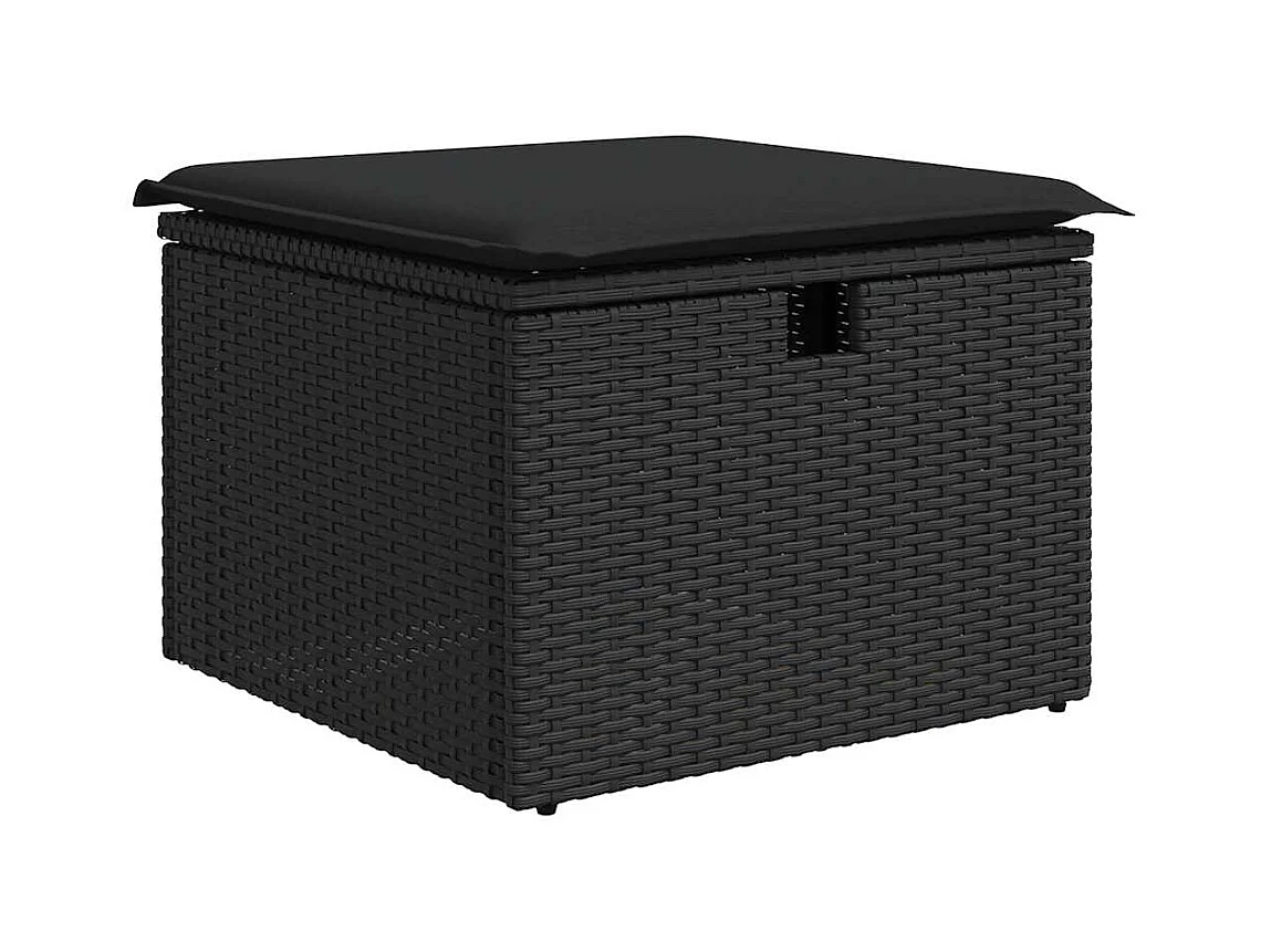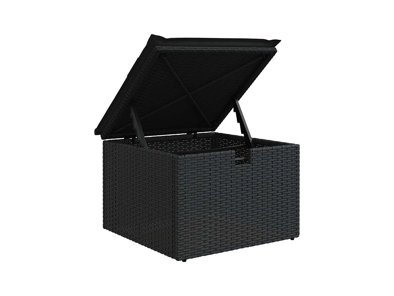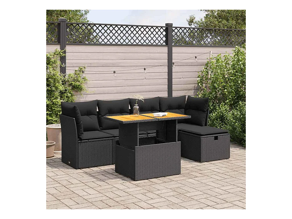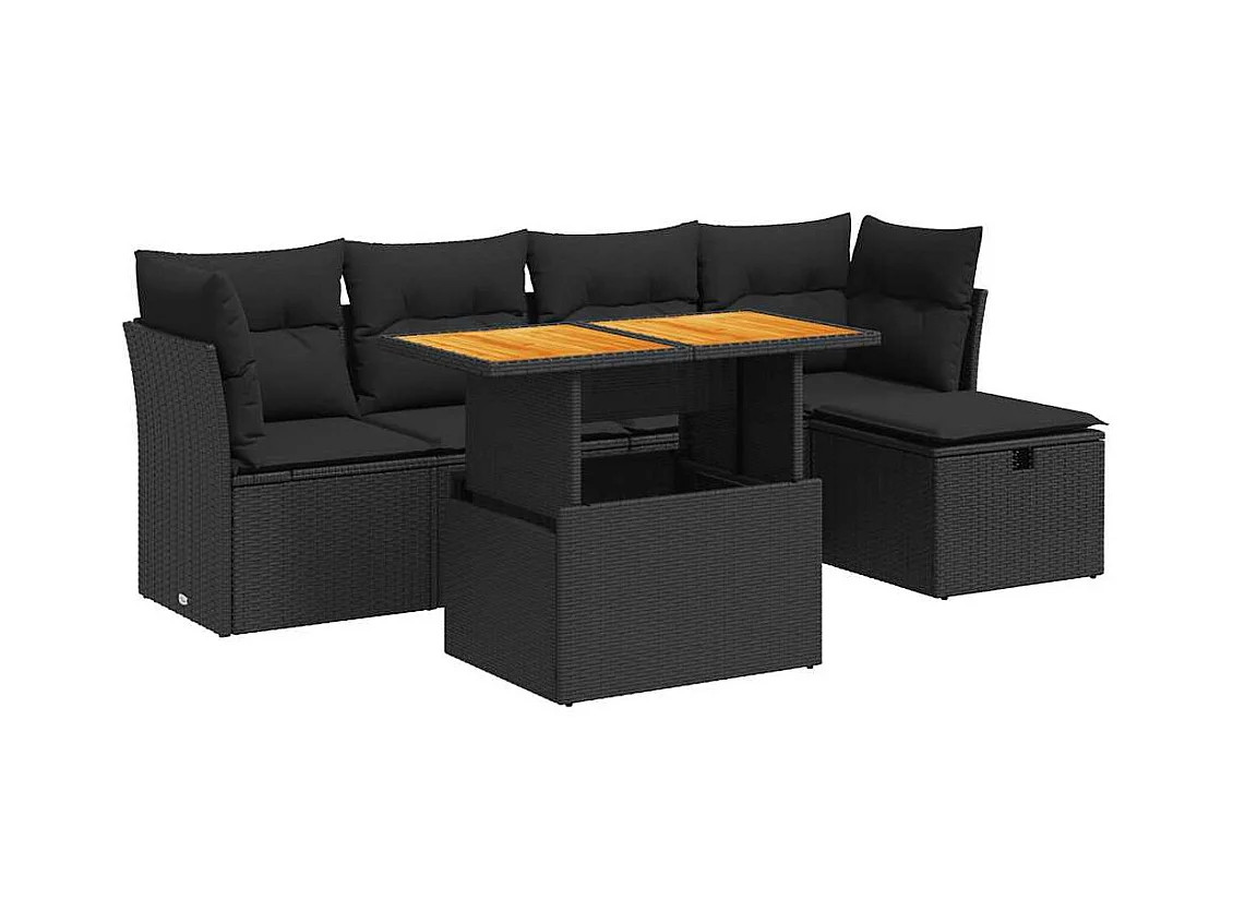 Salon de jardin 6 pcs avec coussins noir résine tressée acacia