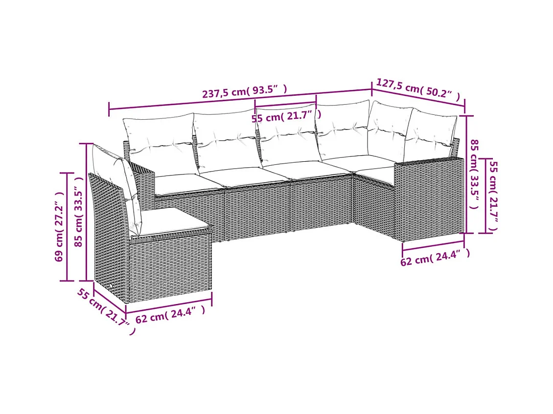 Salon de jardin 6 pcs avec coussins noir résine tressée BE62331