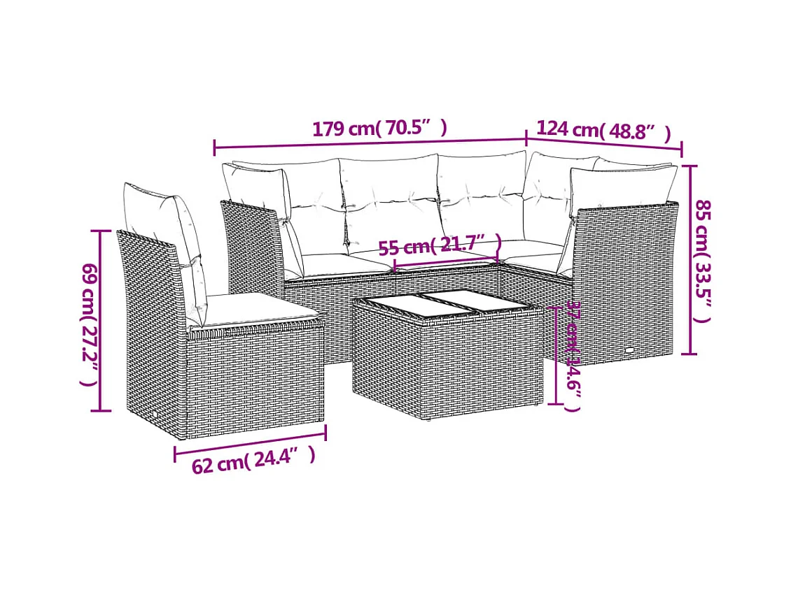 Salon de jardin 6 pièces avec coussins gris clair résine tressée