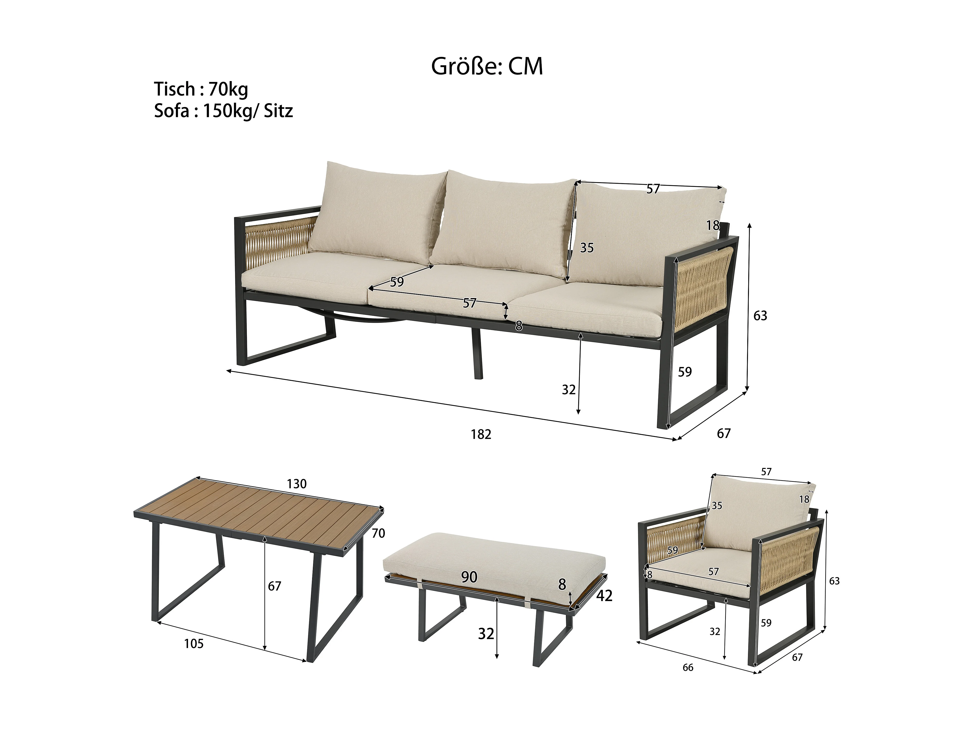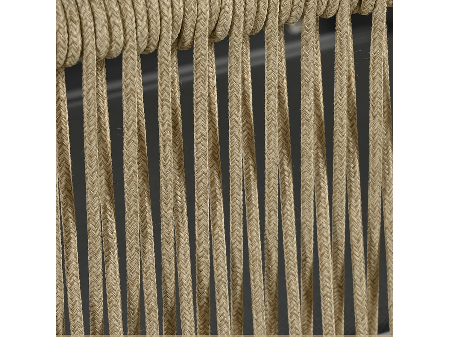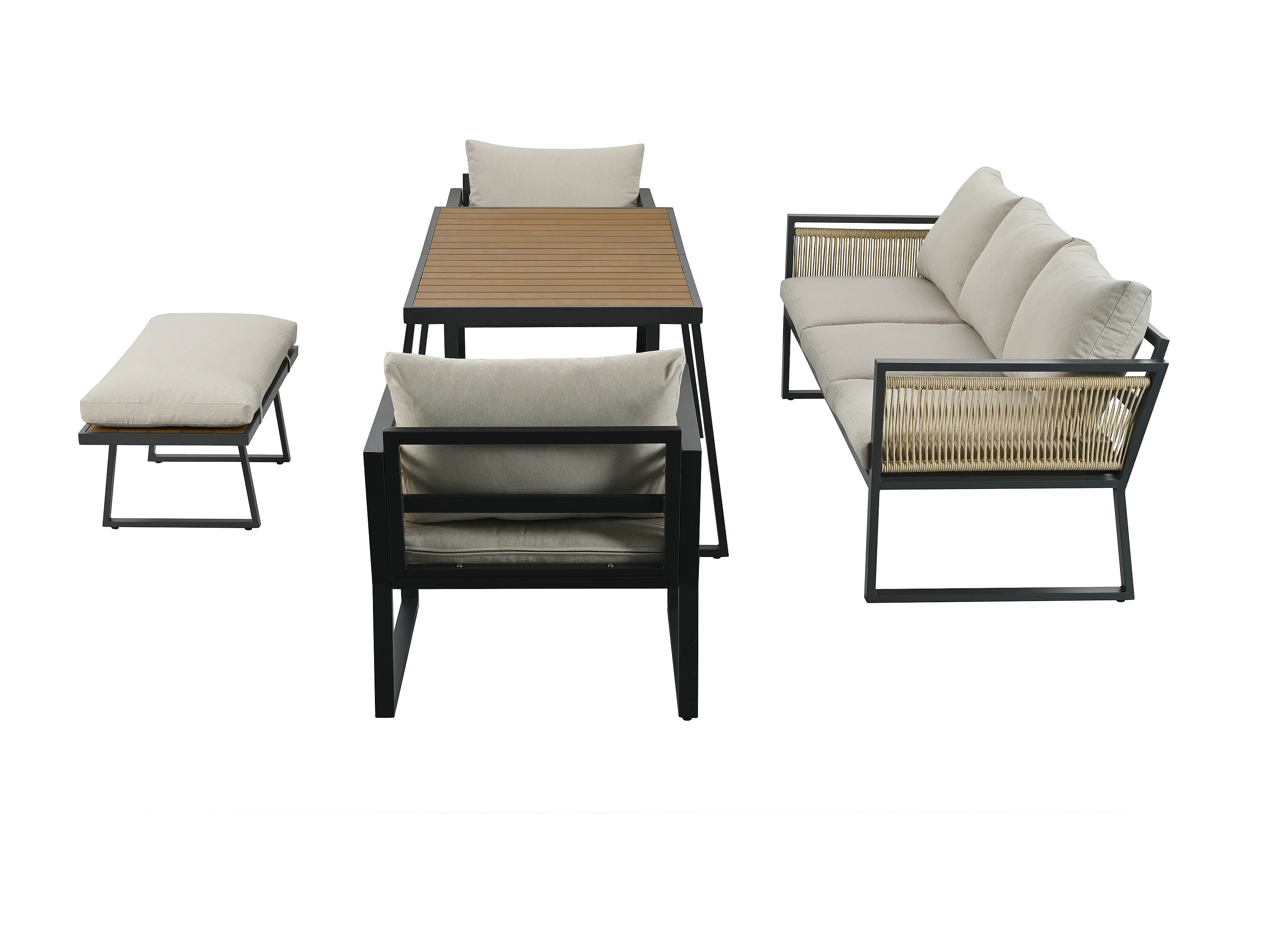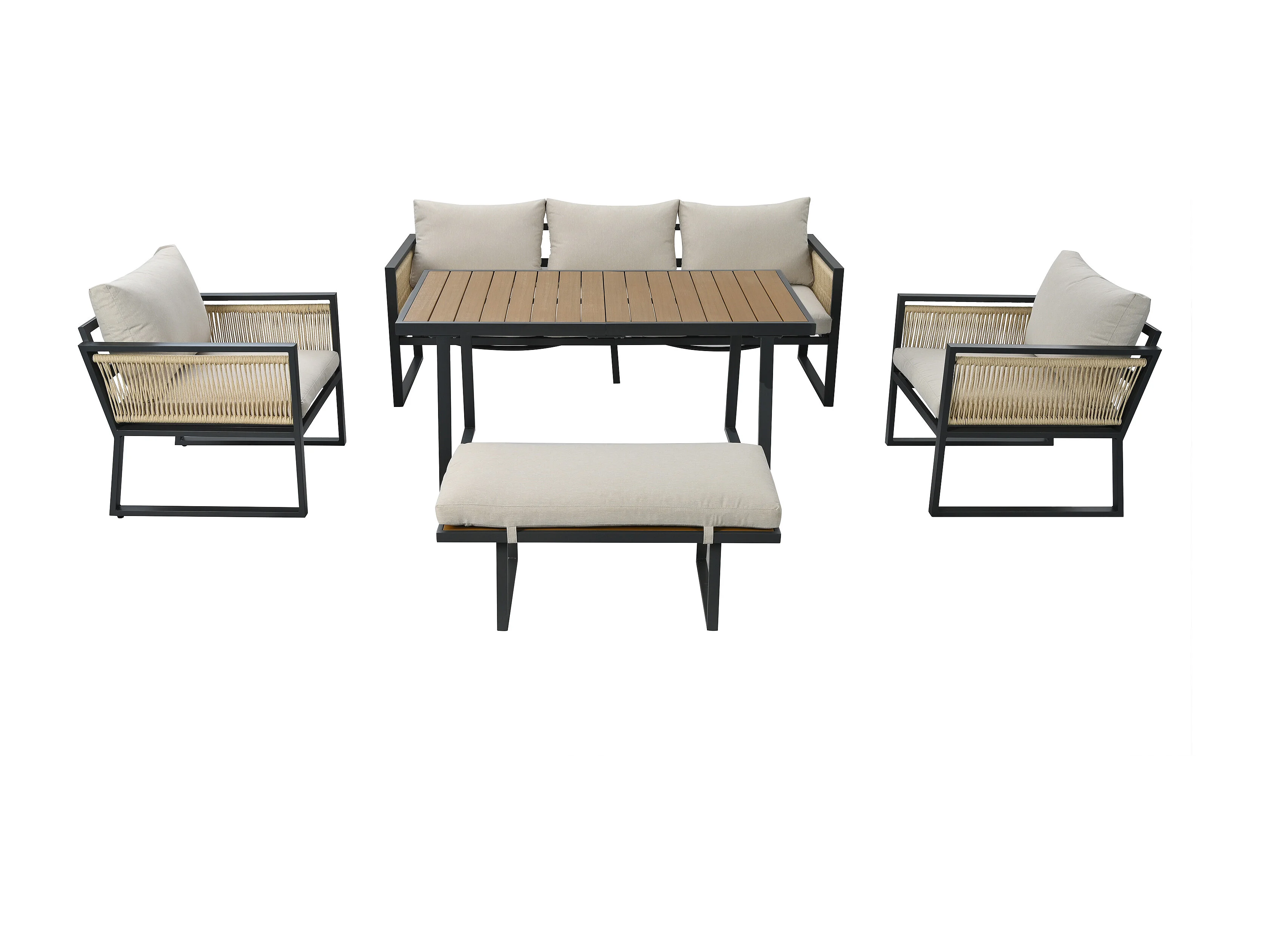 Salon de jardin 6 places - en fer galvanisé léger - en corde - canapé - 2 fauteuils et table basse - avec table à manger - 1 tabouret - Beige
