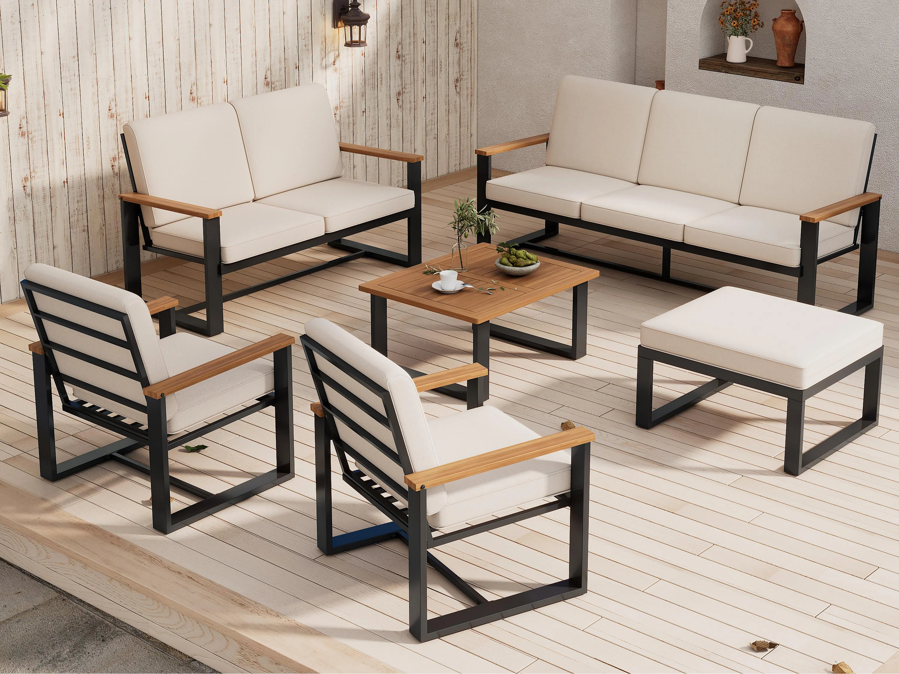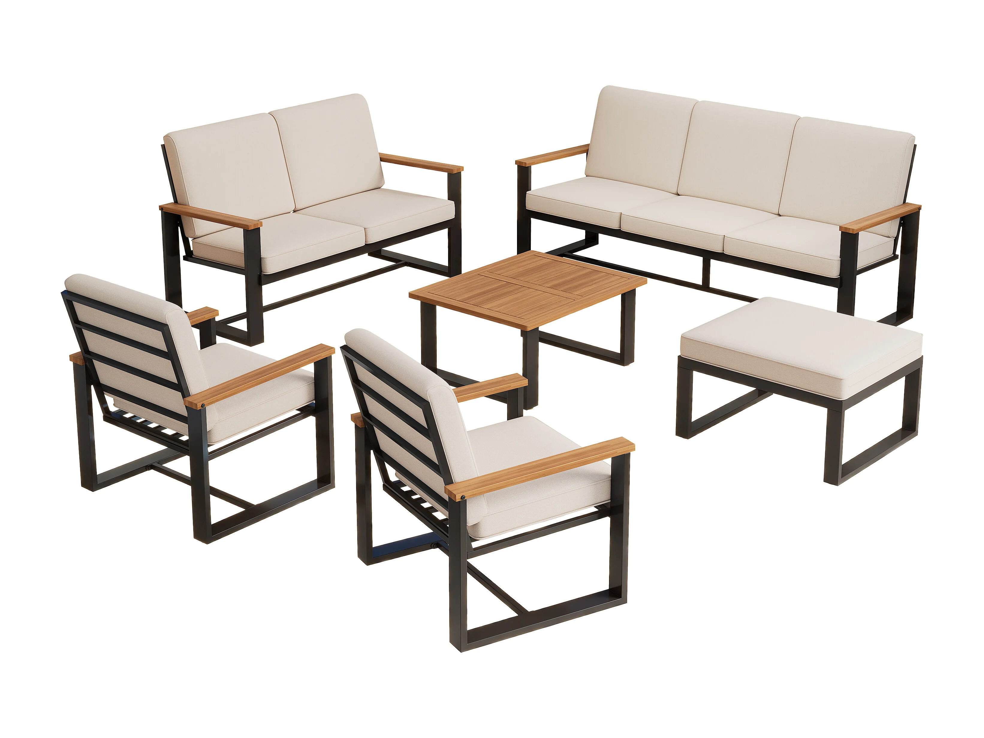 Salon de jardin 7-8 places - en fer galvanisé léger - 1 canapé 3 places - 1 canapé 2 places - 2 fauteuils et table basse - 1 tabouret - Beige