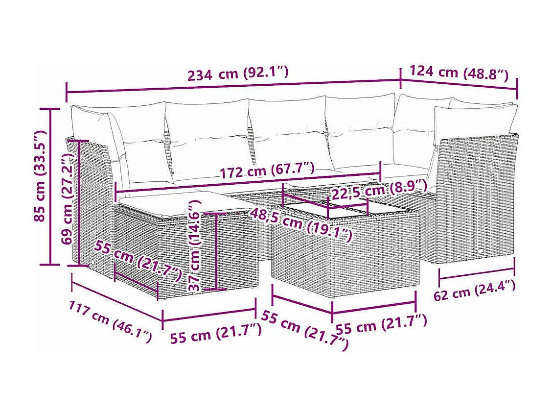 Salon de jardin 7 pcs avec coussins noir résine tressée