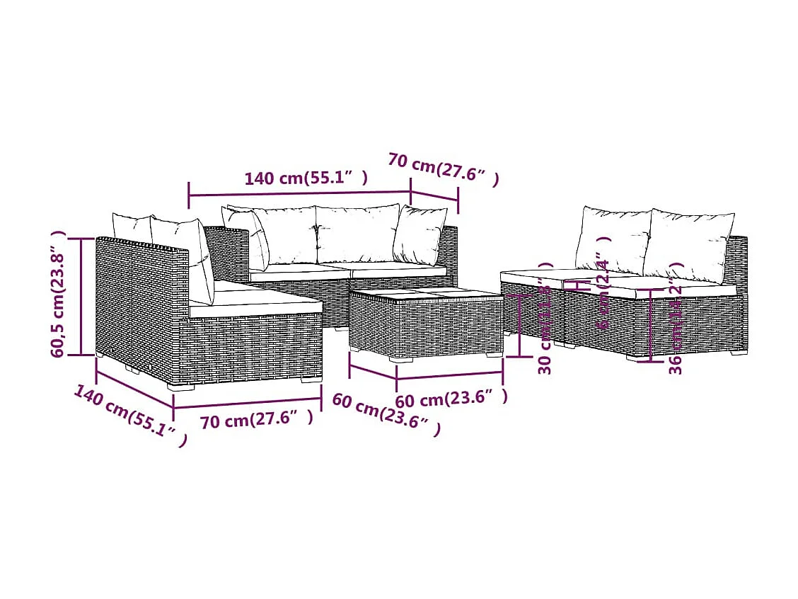 Salon de jardin 7 pcs avec coussins Résine tressée Marron