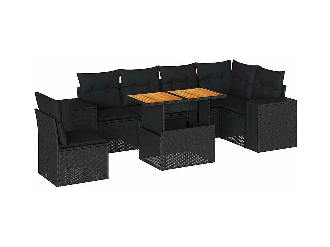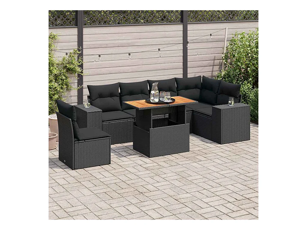Salon de jardin avec coussins 7 pièces noir résine tressée acacia