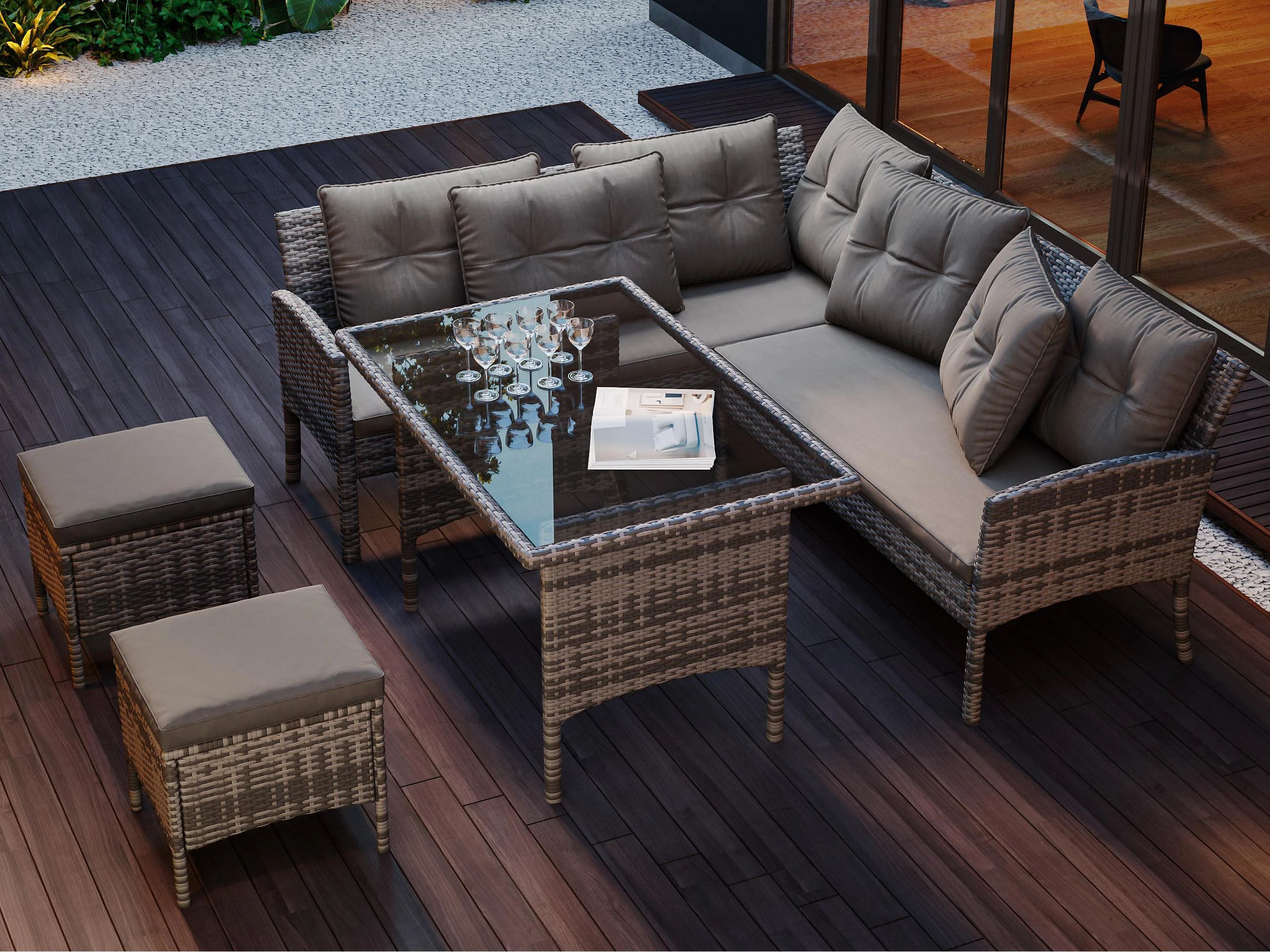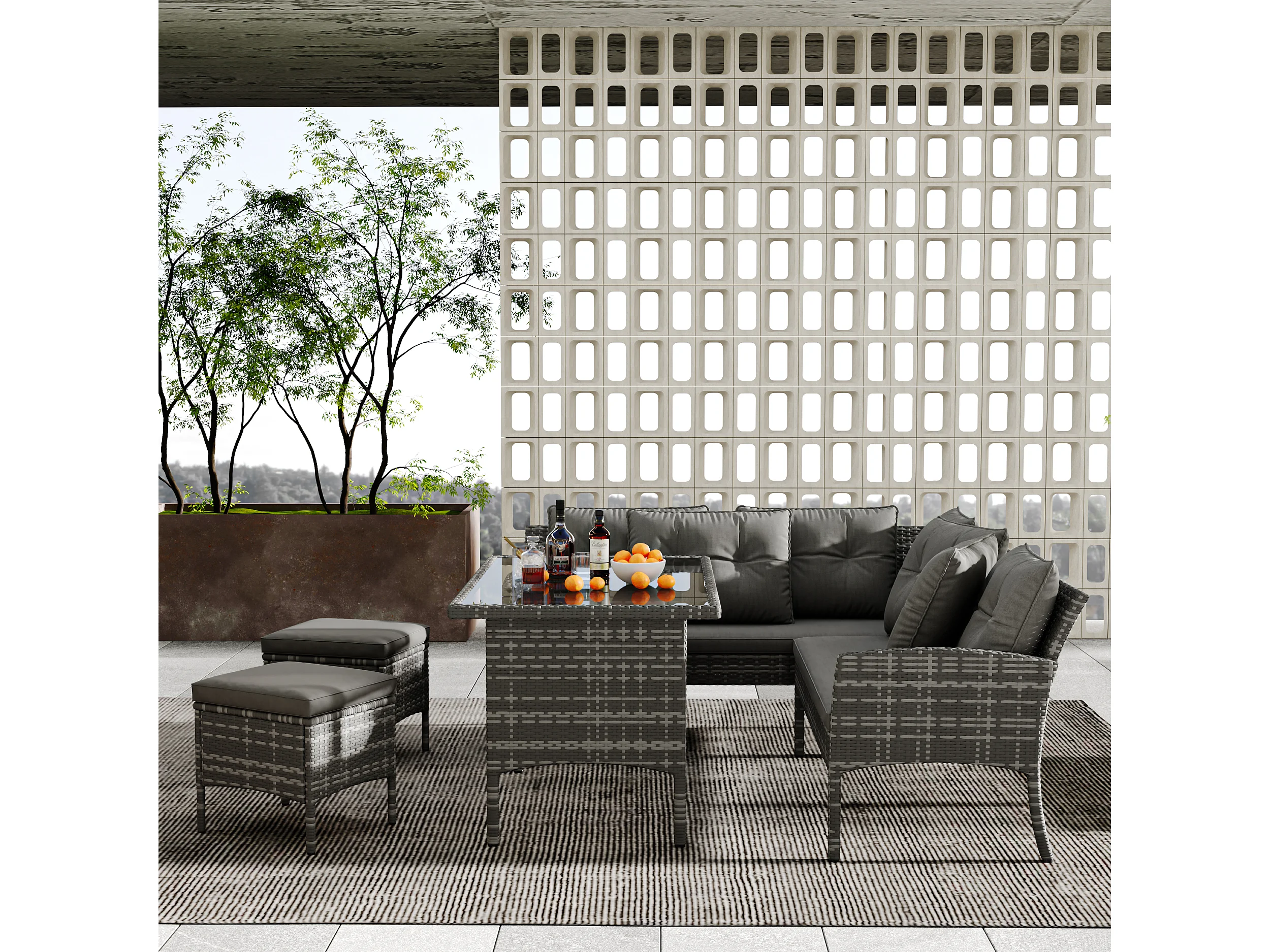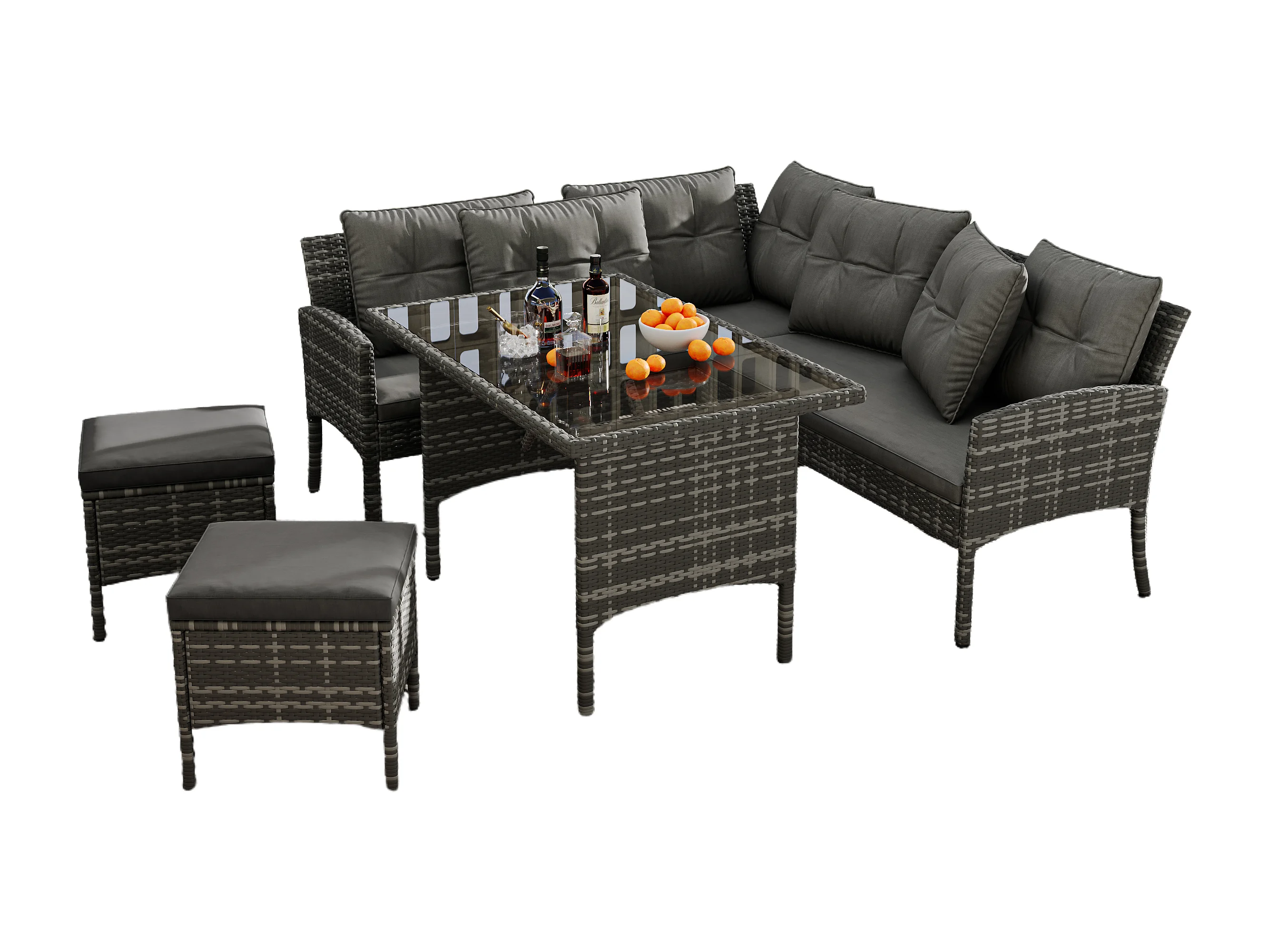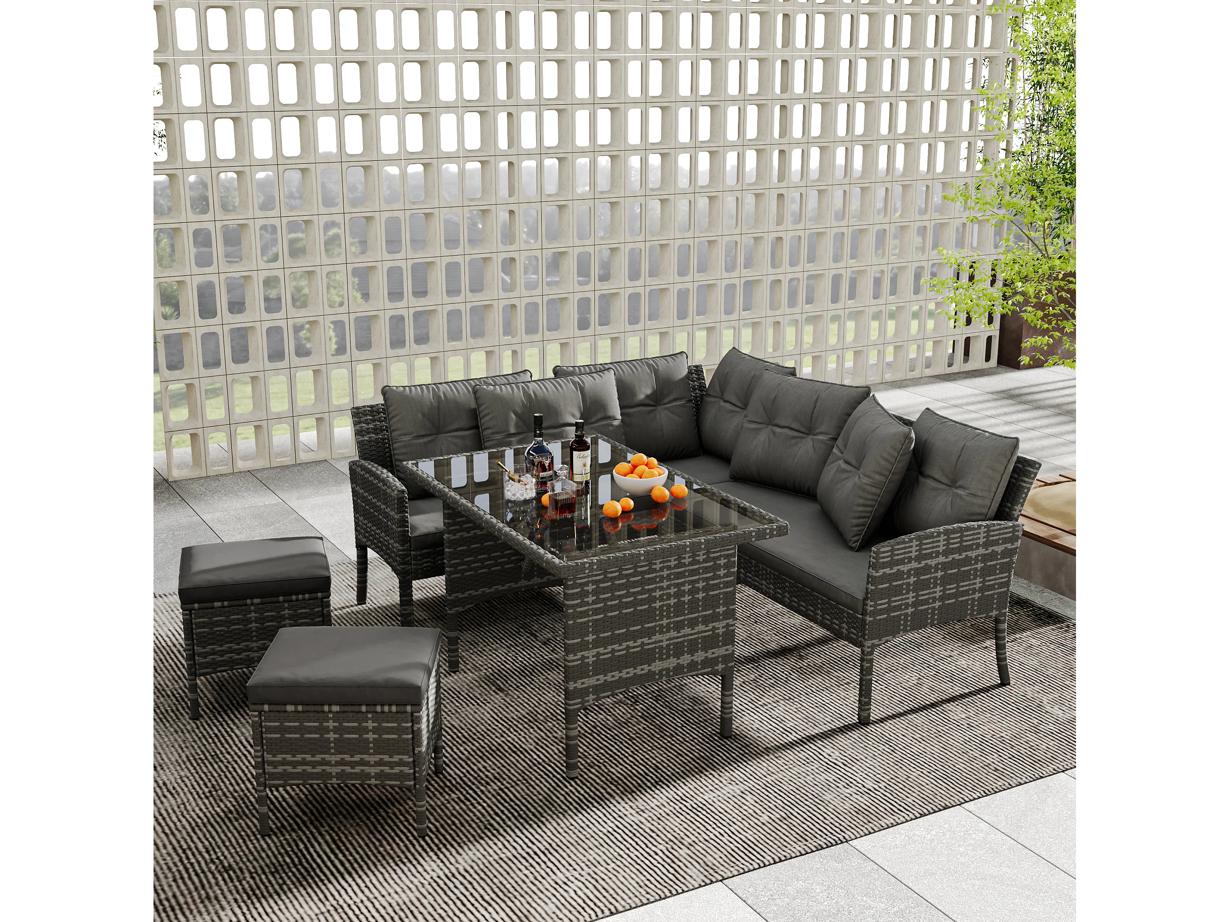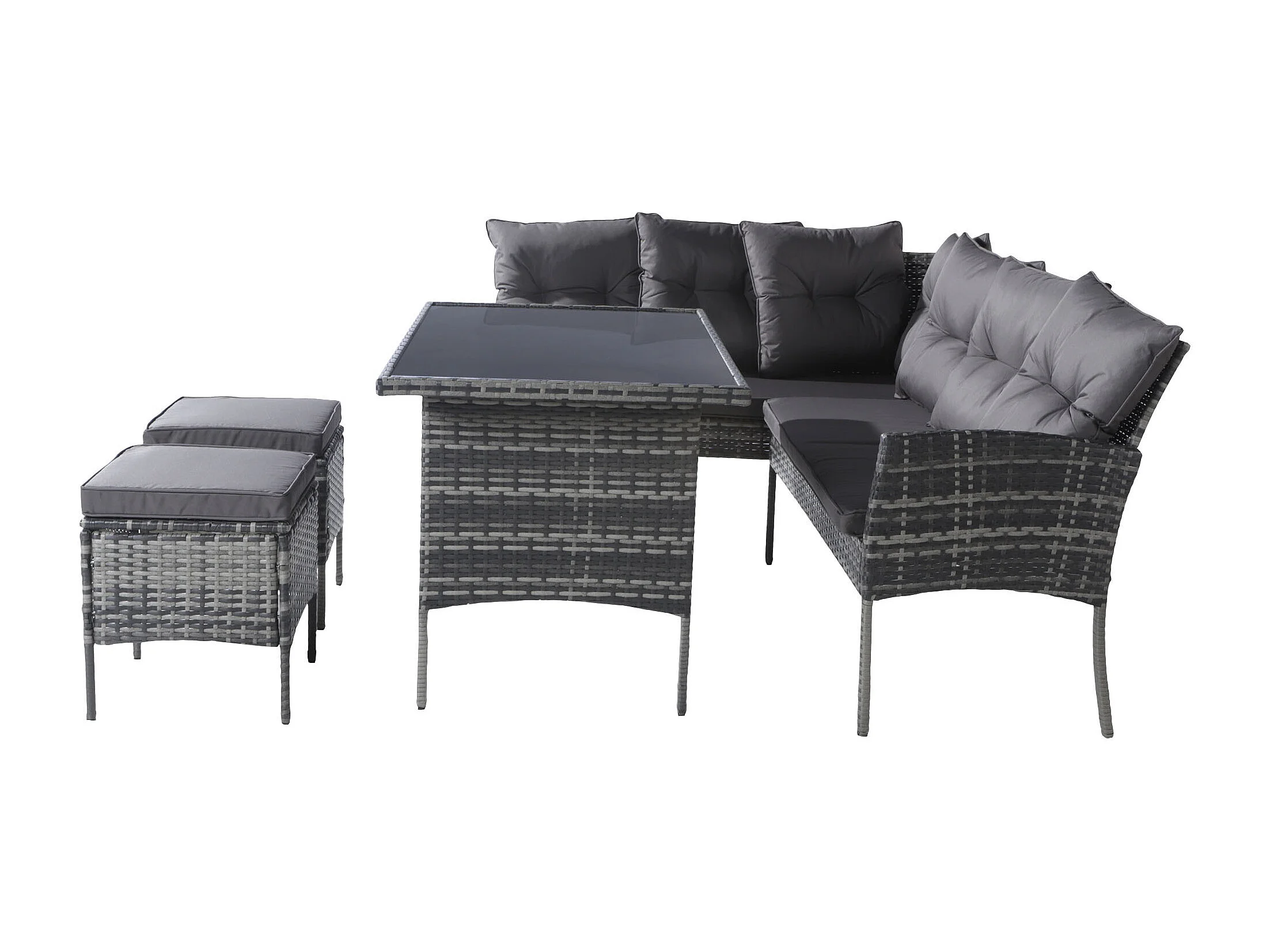 Salon de jardin 7 places en rotin PE - 2 canapés, 2 tabourets et 1 table basse - structure en acier