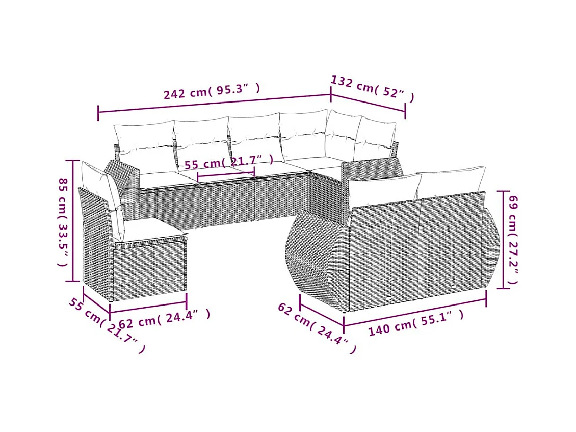 Salon de jardin 8 pcs avec coussins gris clair résine tressée