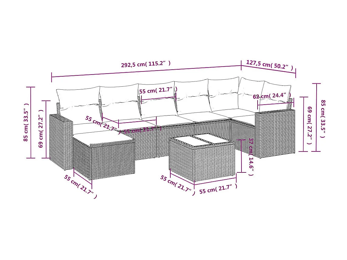 Salon de jardin avec coussins 7 pcs marron résine tressée